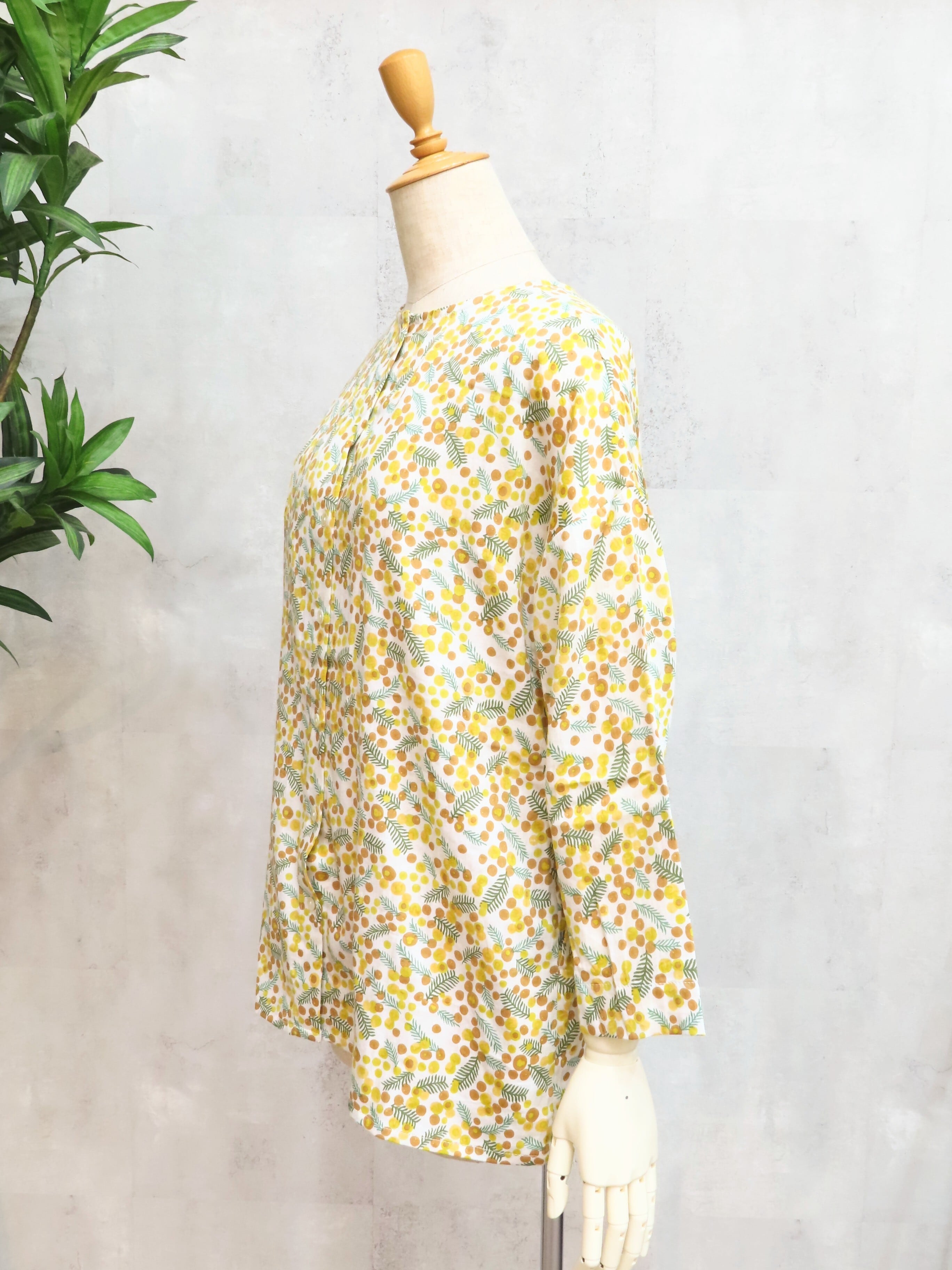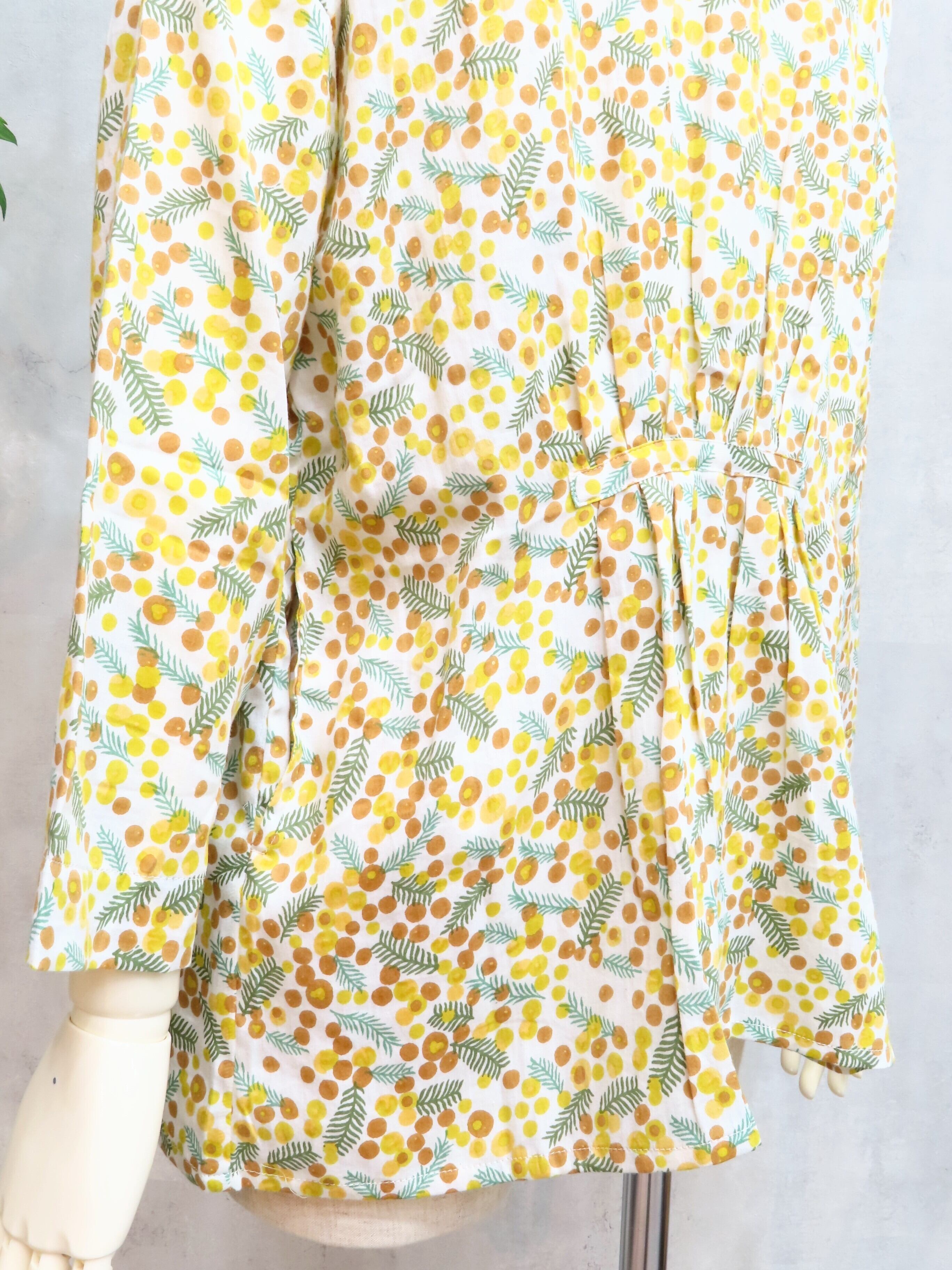 落ち着いたトーンで描かれたミモザ柄が、甘くなりすぎず、大人っぽさを引き立てます。
