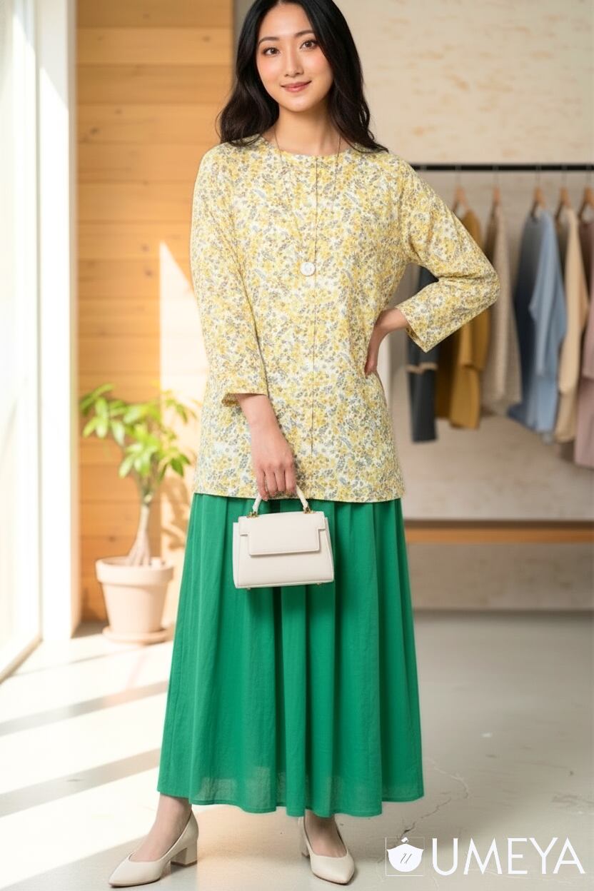 シンプルなボトムスと合わせるだけで、コーディネートがぱっと華やかに。
