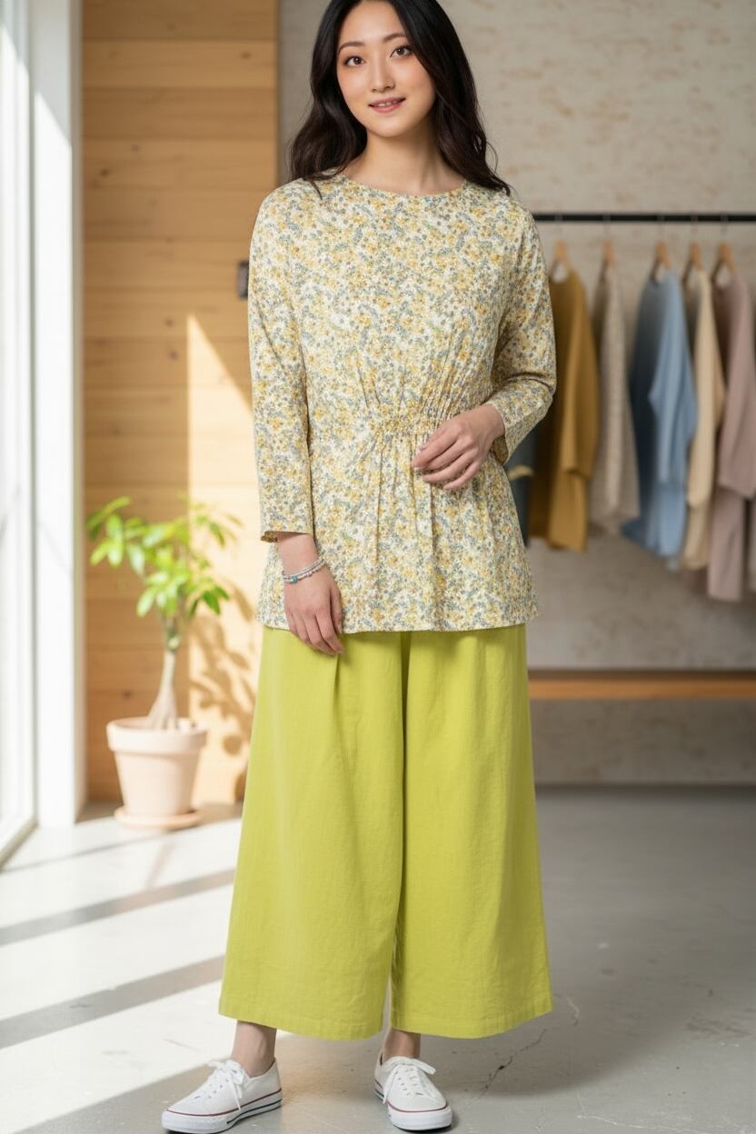 綿100%の素材は通気性がよく肌ざわりも快適で、春らしい軽やかさを感じる着心地です。