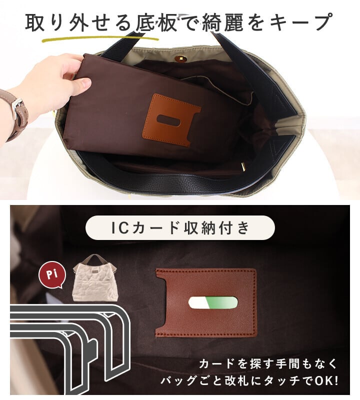 さらに底板にはICカード入れを備えているので、改札にバッグの底面をタッチするだけでスムーズに通過できます。