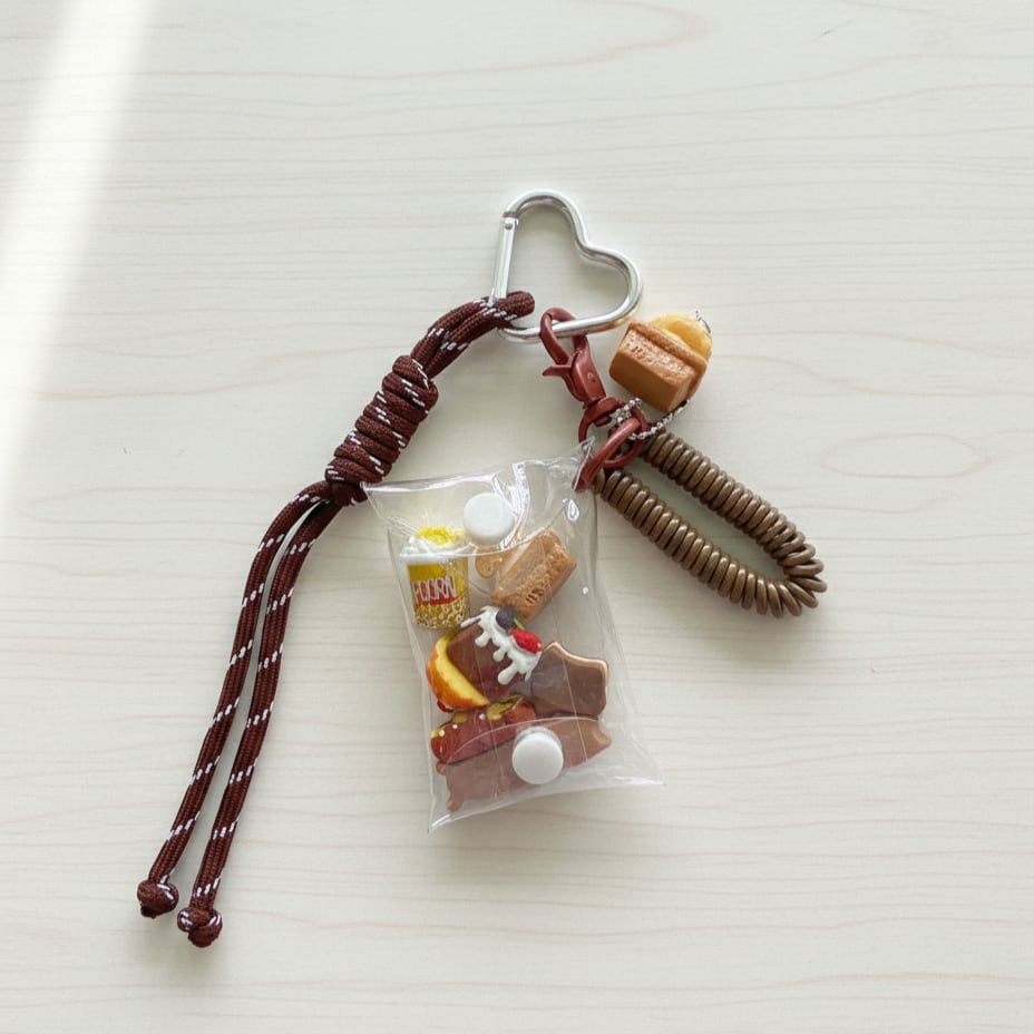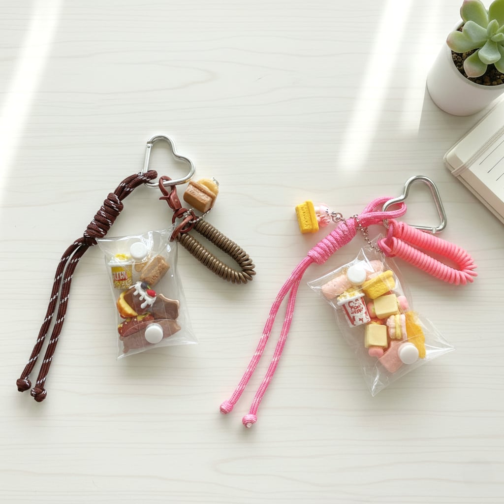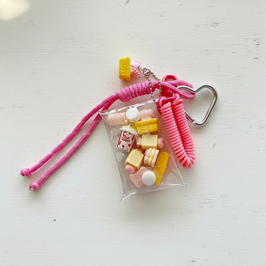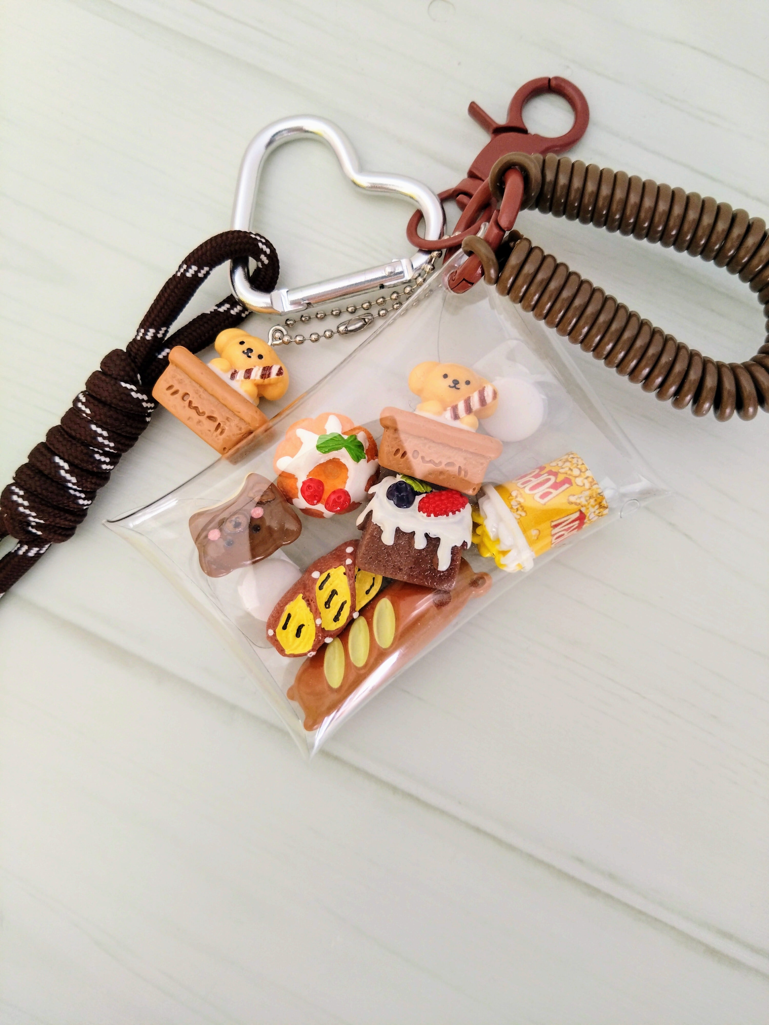透明感のあるクリアポーチにミニチュアスイーツをぎゅっと詰め込んだ遊び心いっぱいのカラビナ付きチャーム。