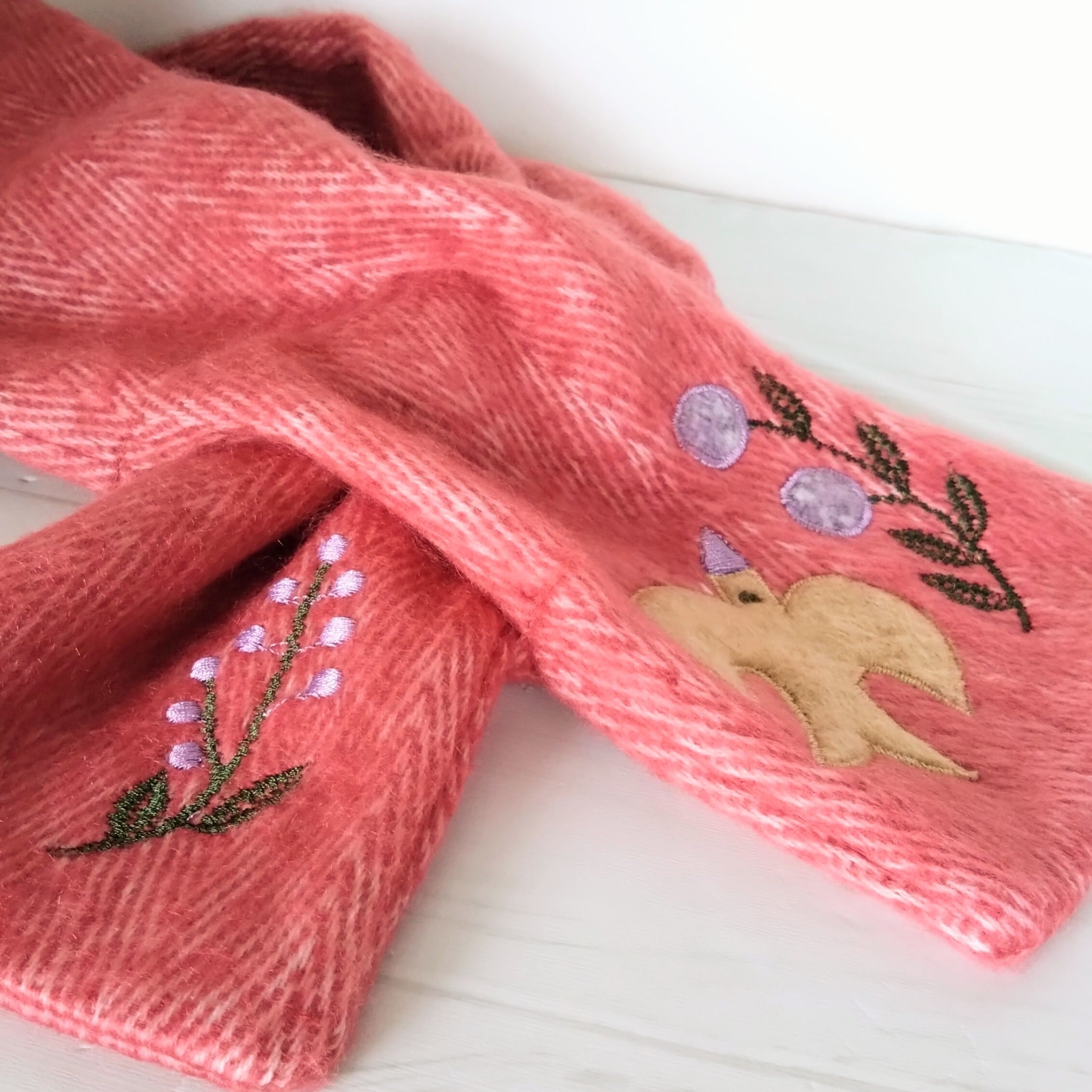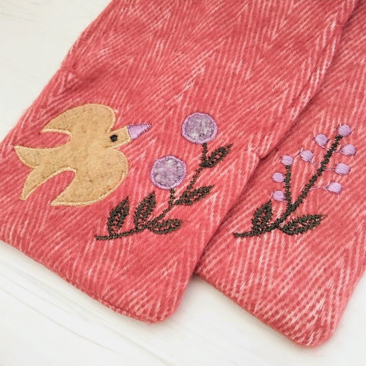 落ち着いた色合いが顔まわりをやさしく包み、鳥と花のアップリケがさりげなく華を添えてくれます。