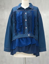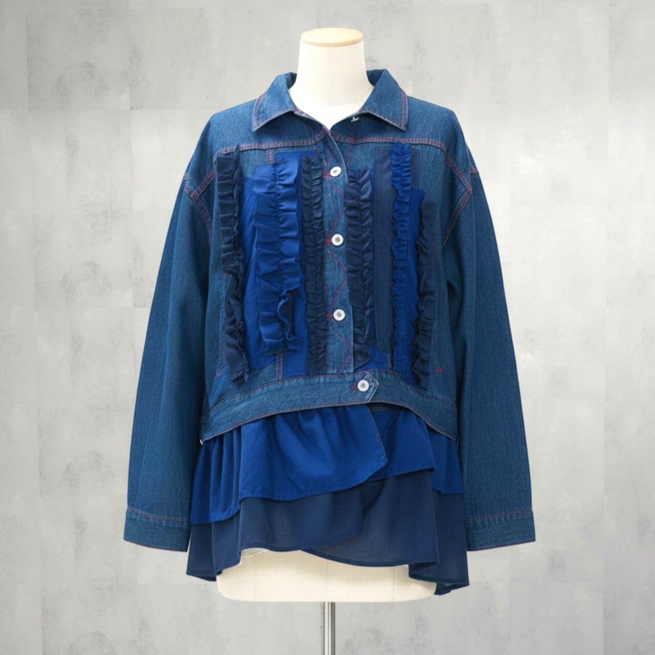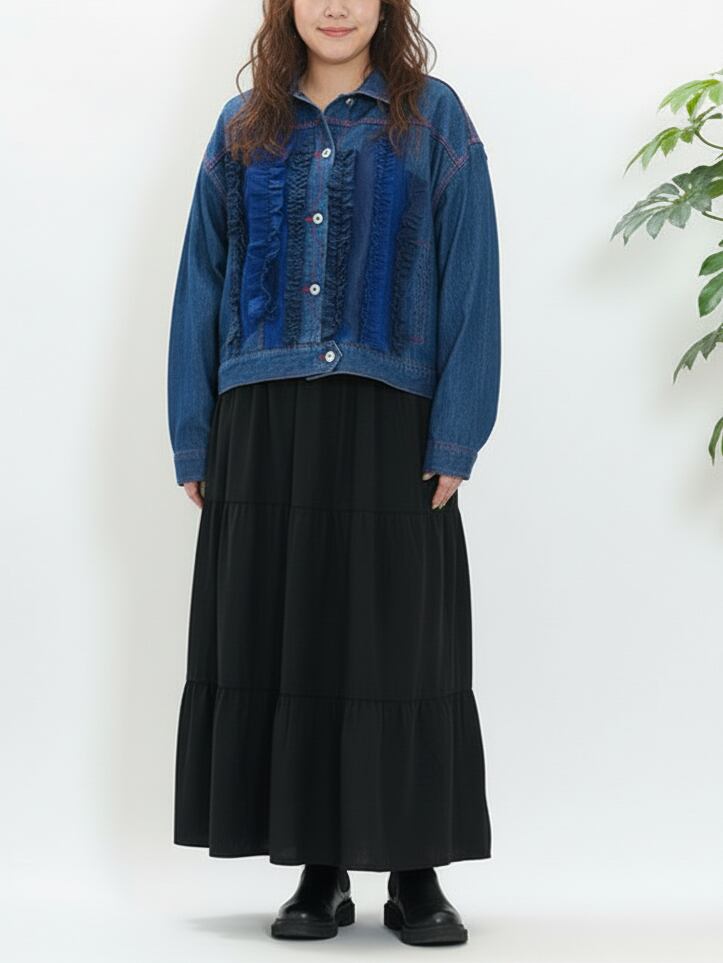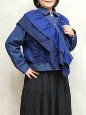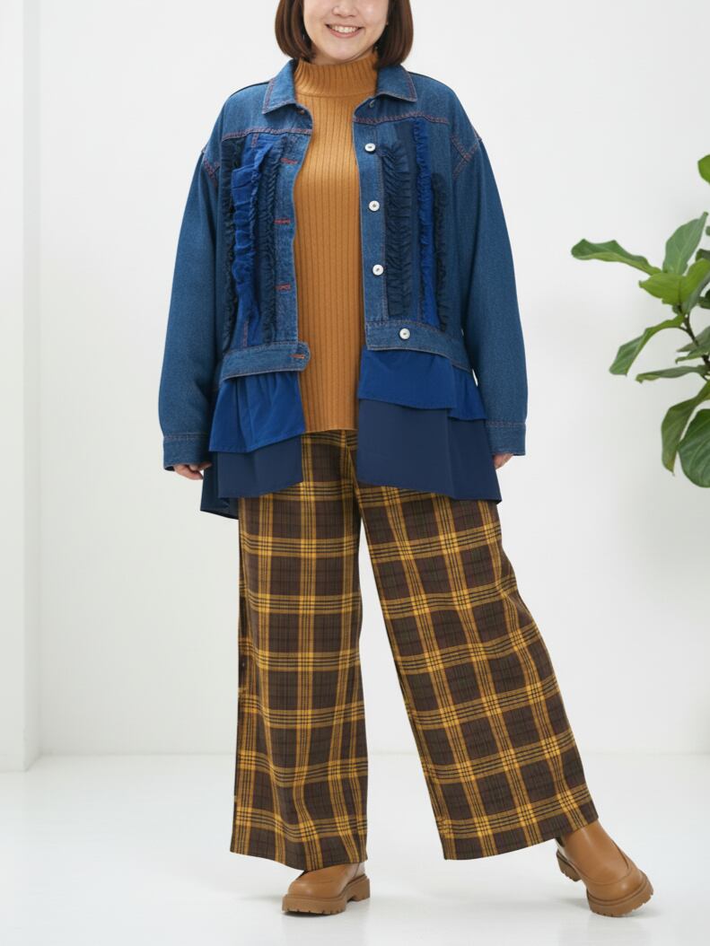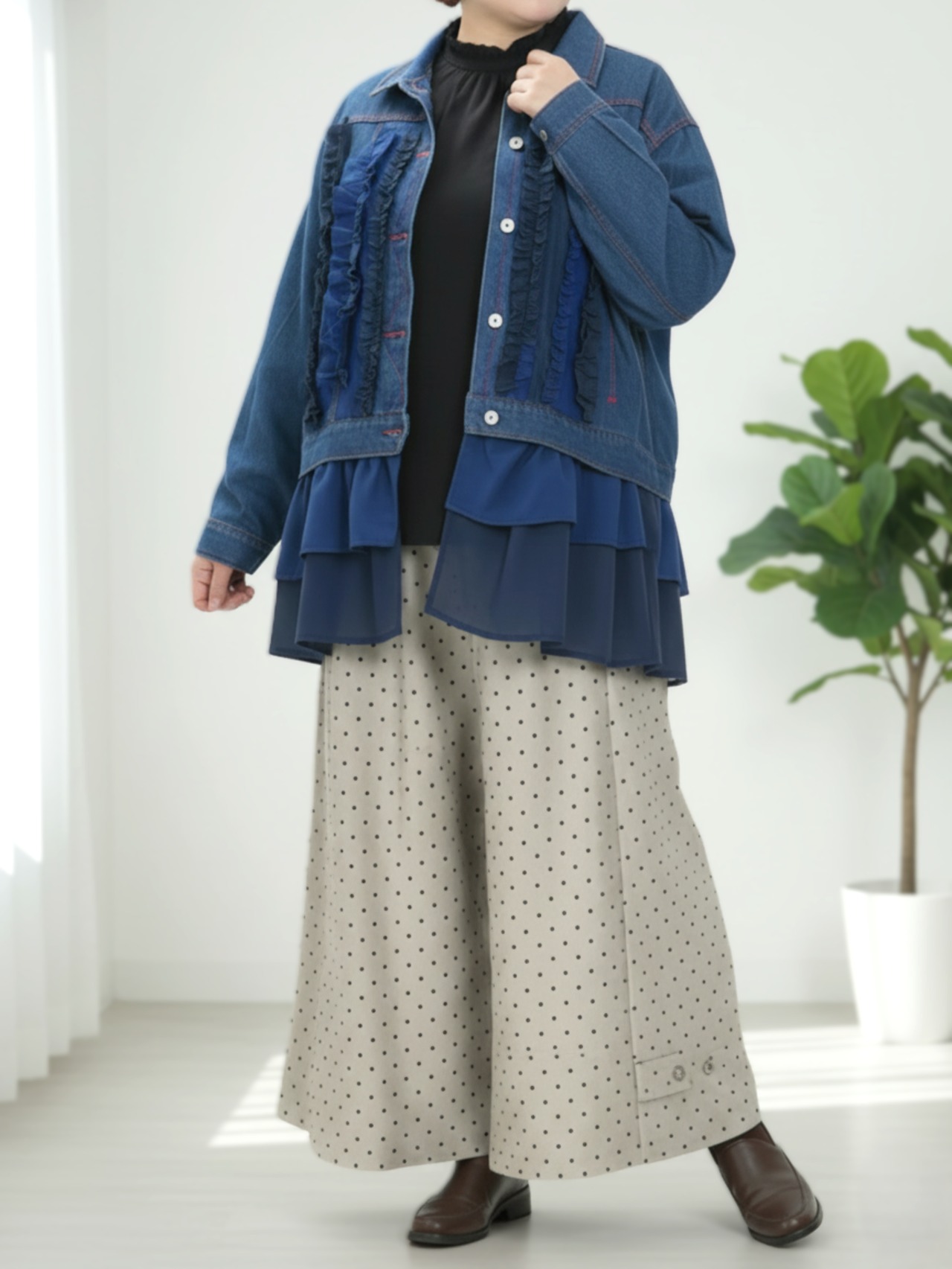 デニムとスレキを組み合わせたランダムフリルは動くたびに軽やかに揺れ、ミドル世代の女性が取り入れやすい上品な可愛さを演出。