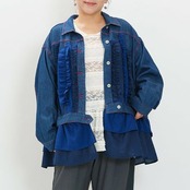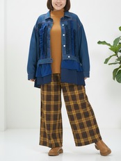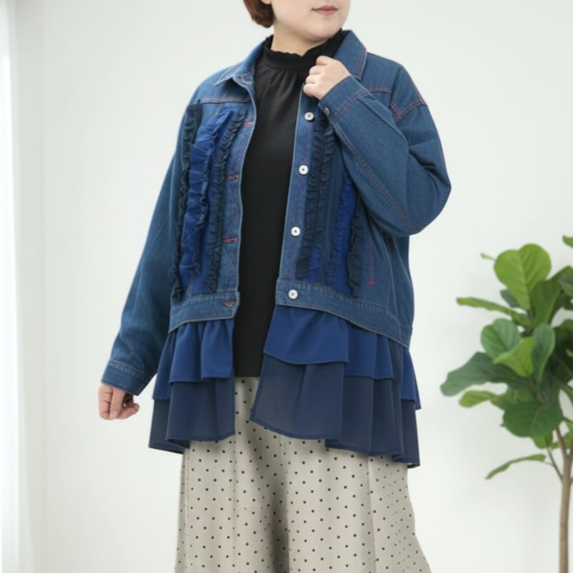 オオラカらしい甘さと大人の落ち着きを両立し、ふくよかな体型の方でも窮屈さを感じにくい、柔らかな着心地のデニムジャケット。