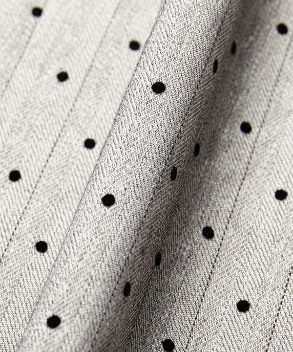 ヘリンボーン地にストライプ糸を織り込み、さらにフロッキーのドットを重ねた生地は、派手すぎず上品。