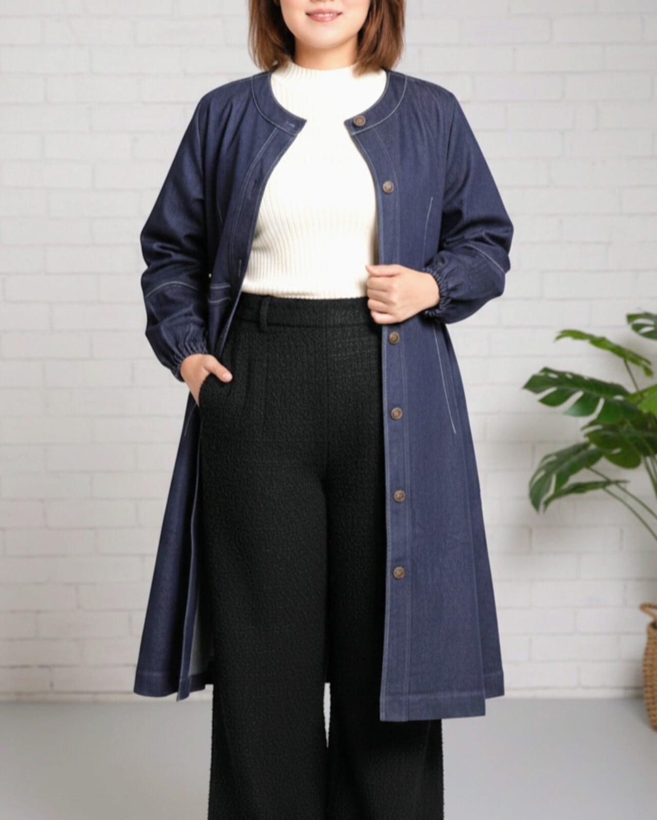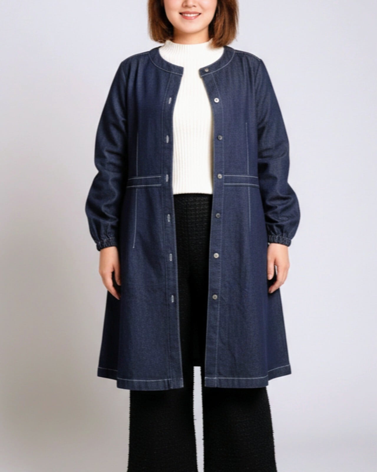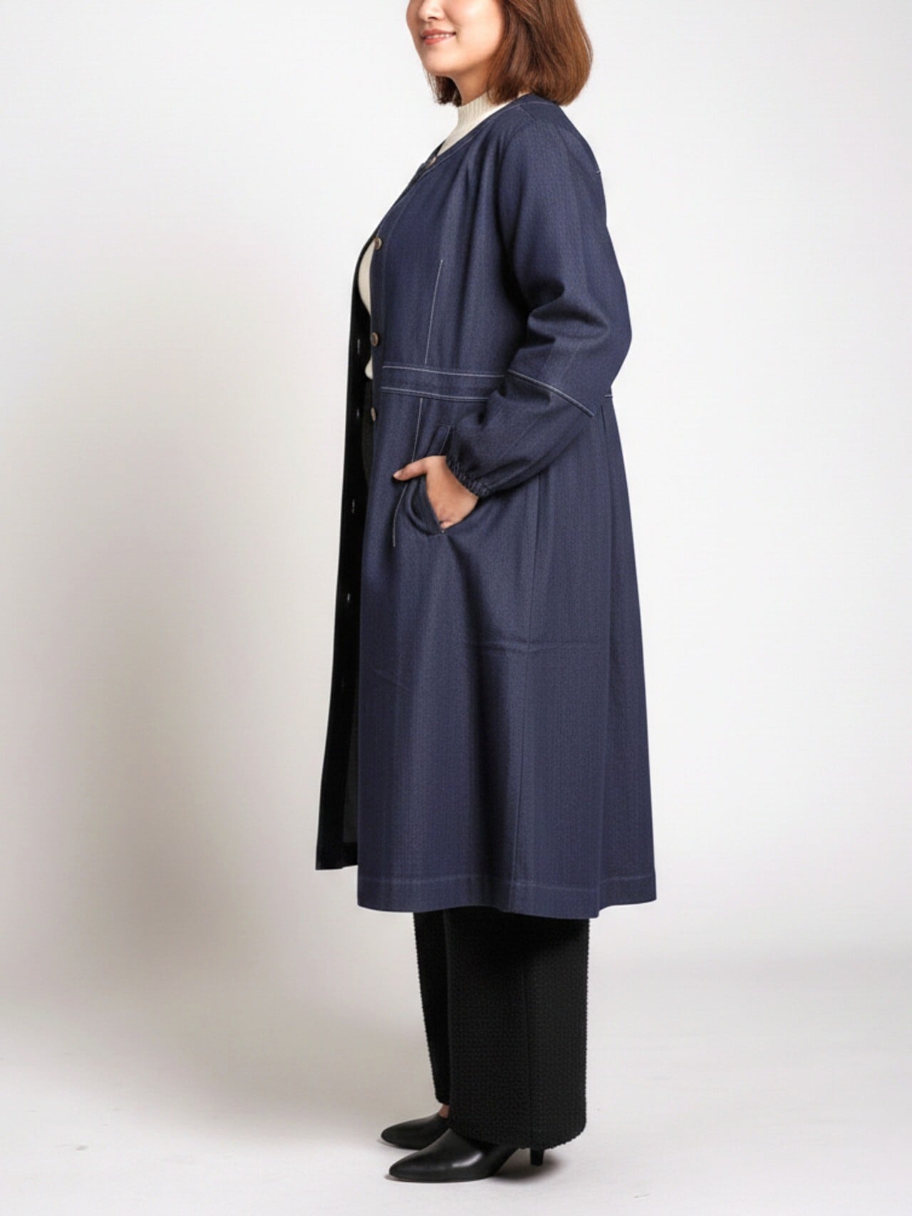 ノーカラー仕立てで首元をすっきり見せ、顔周りが明るい印象に。