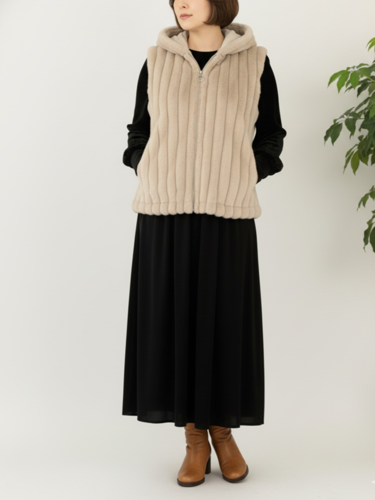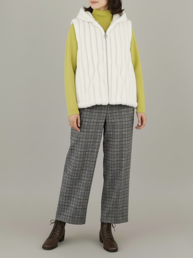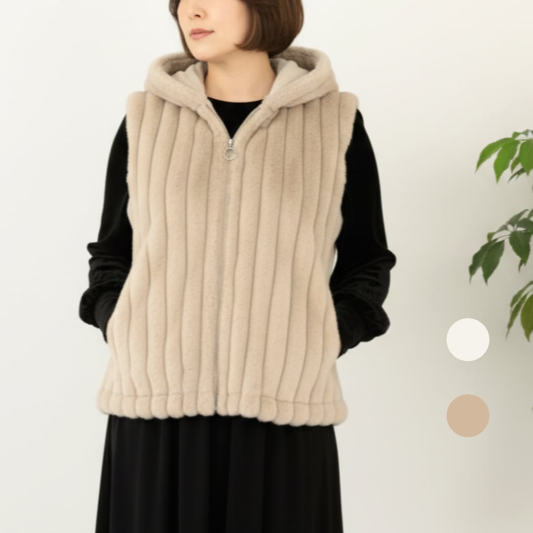 縦模様のファーが視線をすっと流し、全体をすっきりと見せてくれるため、年齢や体型を問わず“無理なくきれい”を叶えてくれます。