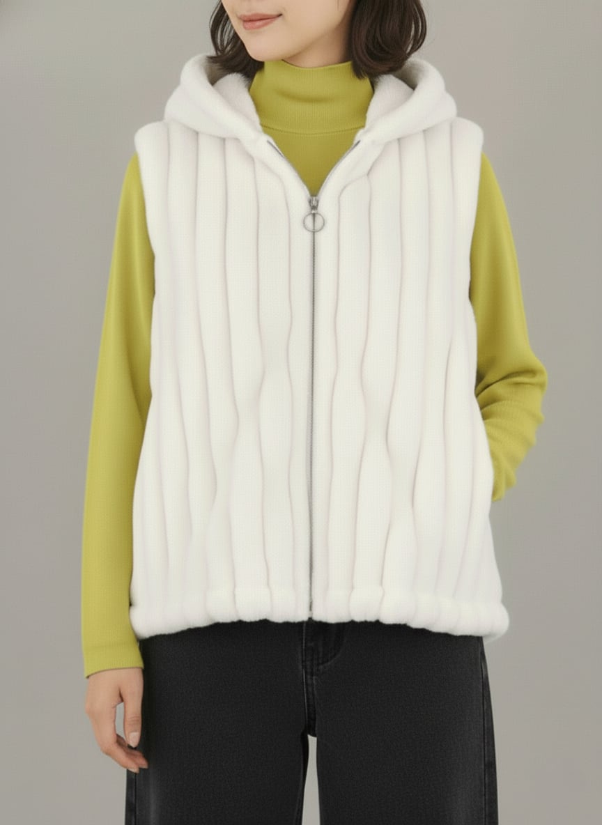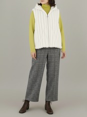 柔らかな肌触りと上質な質感のエコファー(フェイクファー)が、見た目にも気分にもほどよい華やぎを添えてくれるベストです。