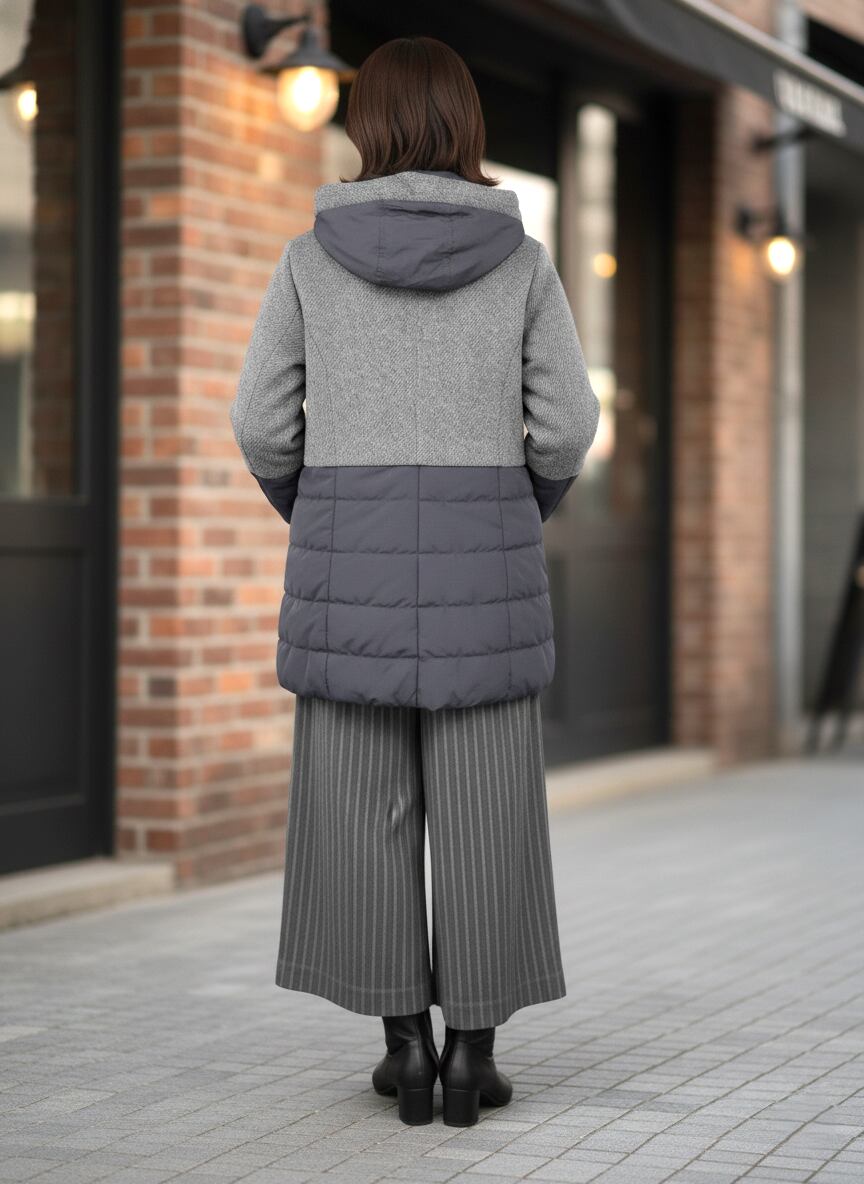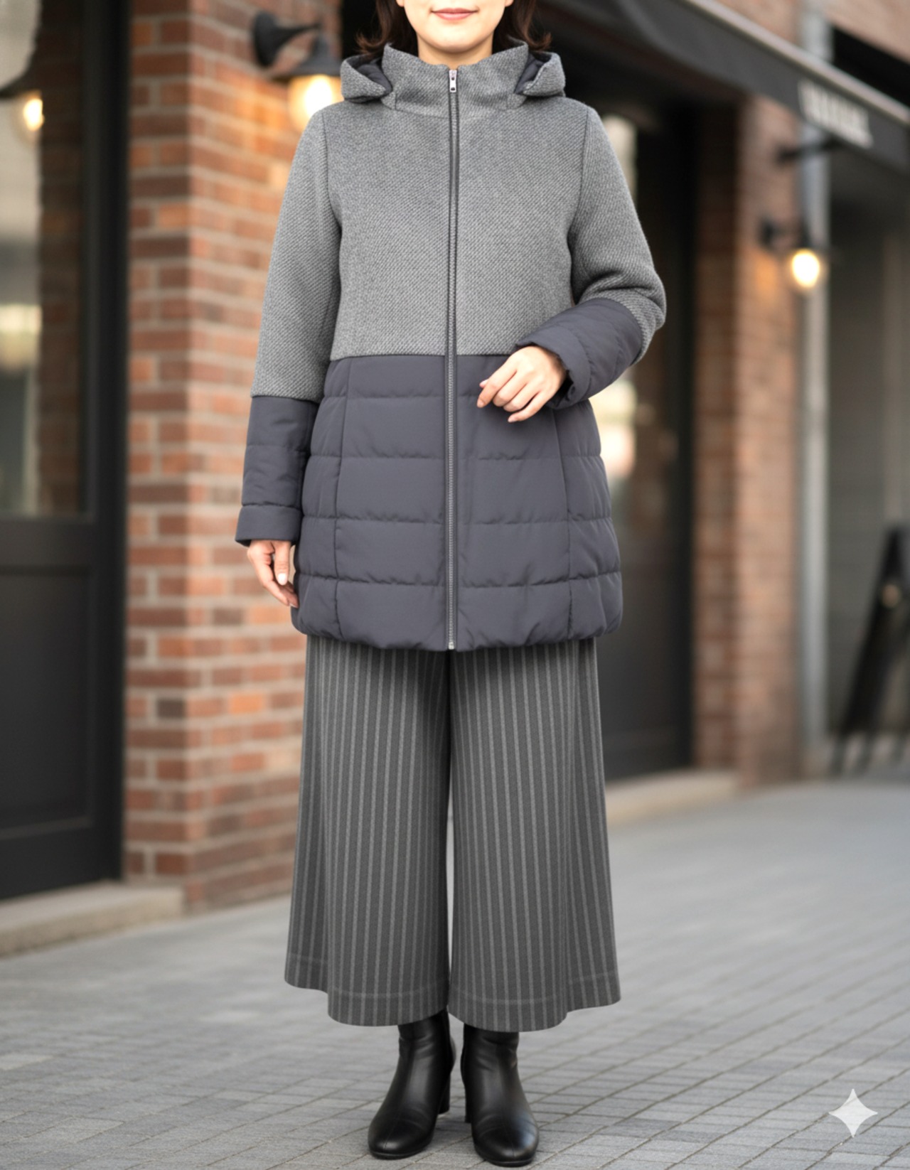 厚手のトップスの上から羽織ってももたつかず、自然なゆとりでバランスよく見せてくれるシルエットです。