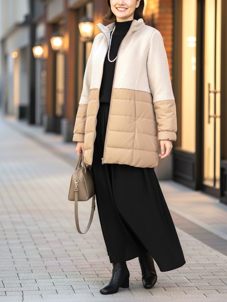 あたたかみのあるウール混素材と中綿キルトを掛け合わせた、気軽に羽織れる軽量コート。