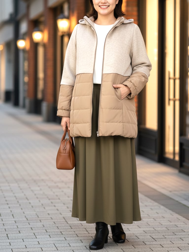 異素材の切り替えが自然な立体感を生み、上半身の気になるラインをさりげなくカバー。