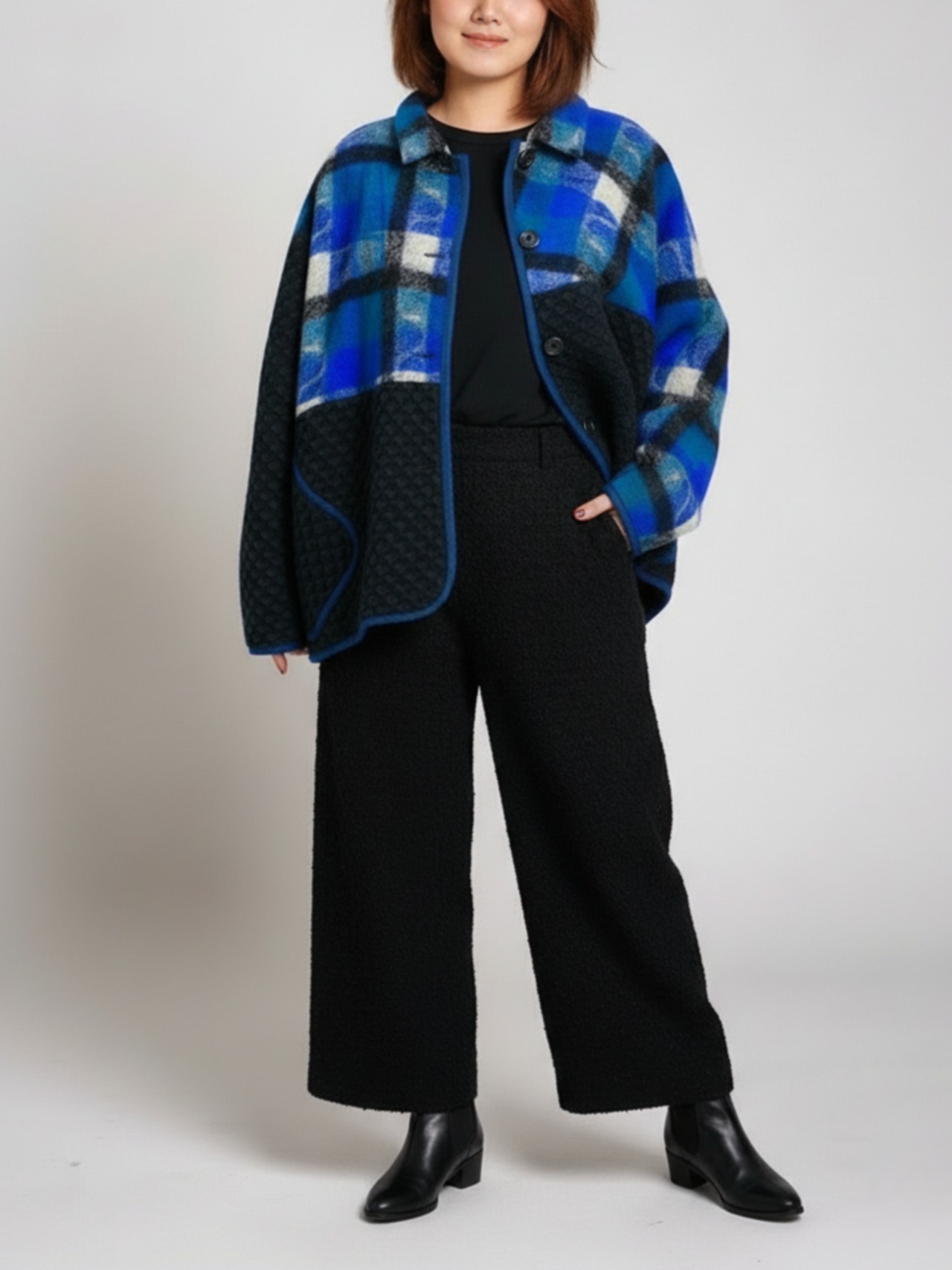 チェック柄を縦・横・斜めに組み合わせたアシンメトリーデザインは、視線を分散させながら立体感を生み、体型を自然にすっきり見せてくれます。