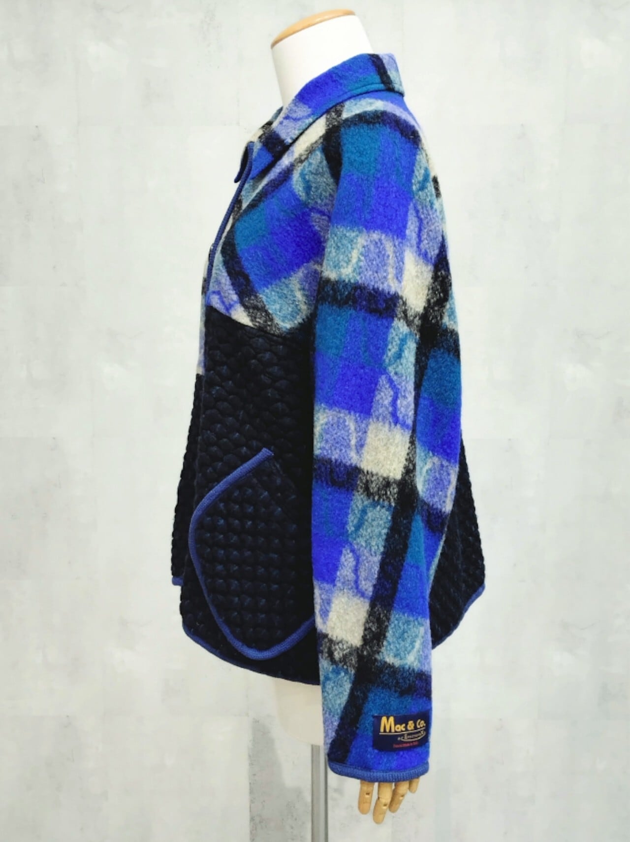 前開きのボタン仕様で着脱がしやすく、前立てやポケット周りに施したニットテープがさりげないアクセントに。