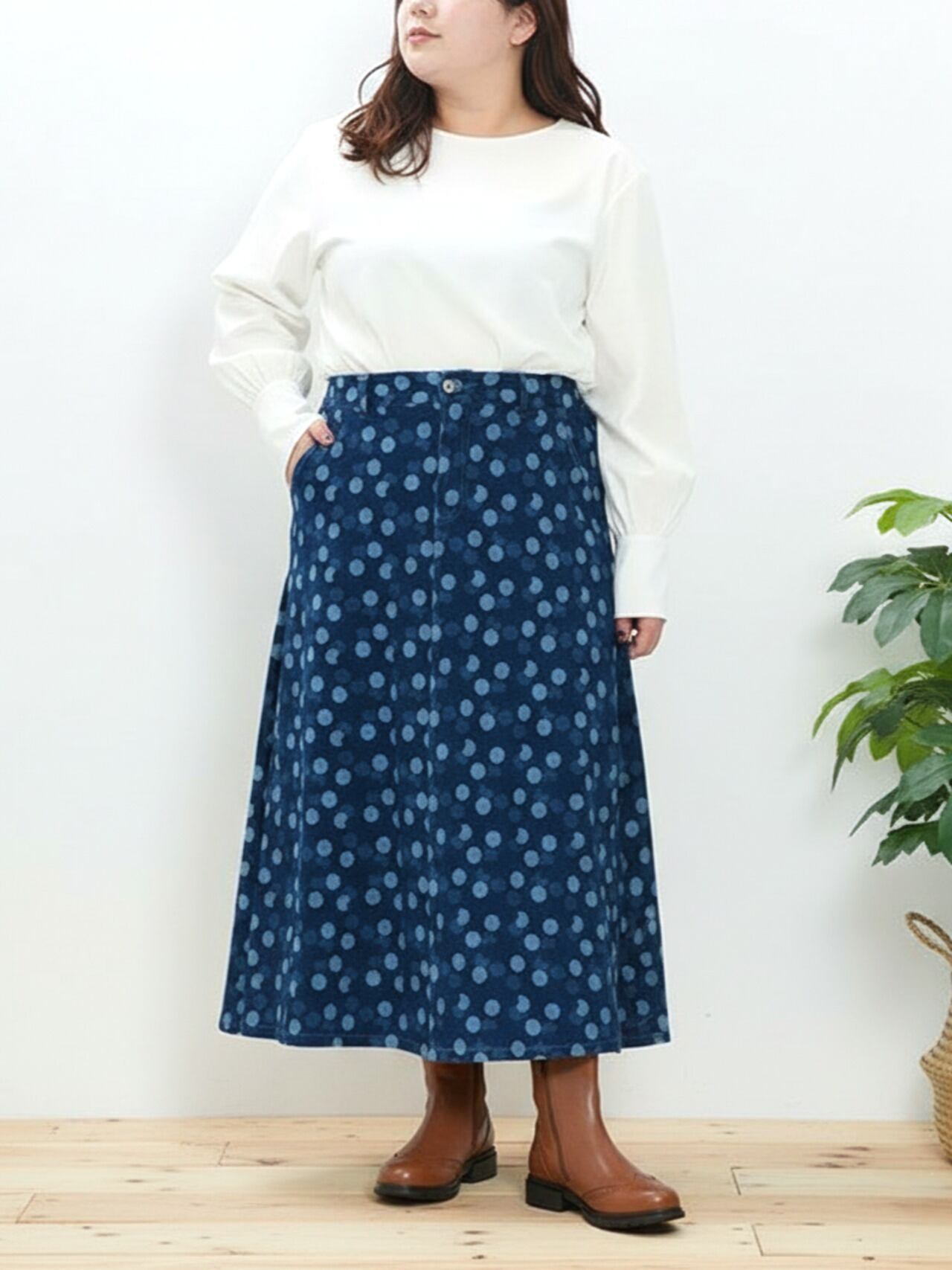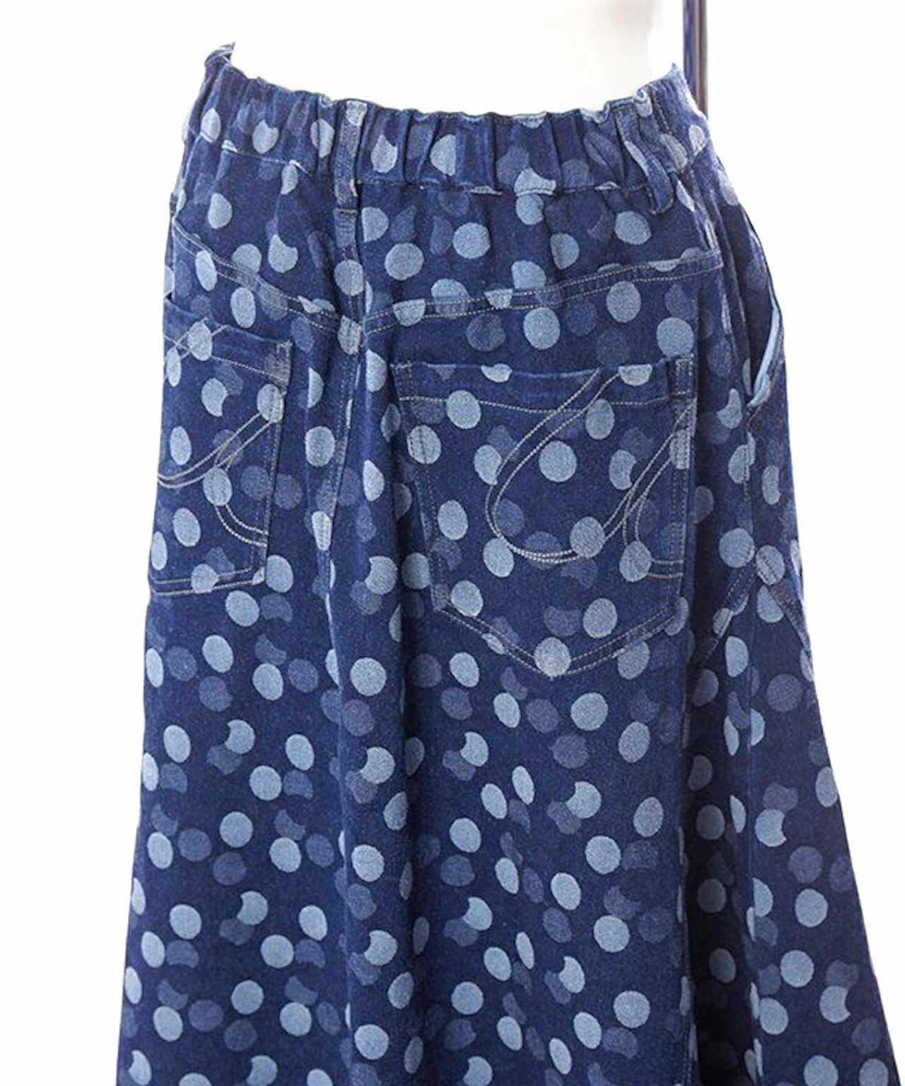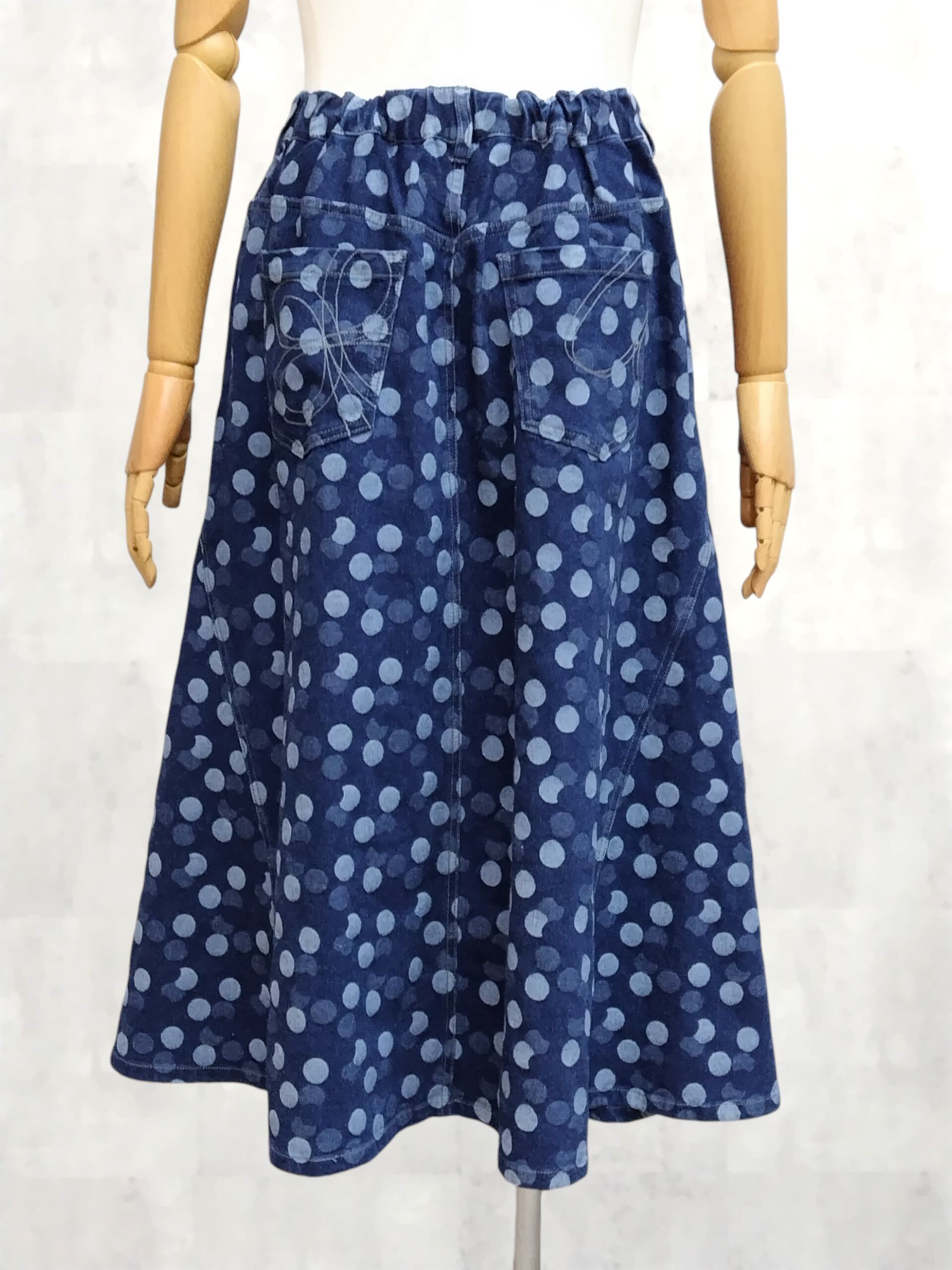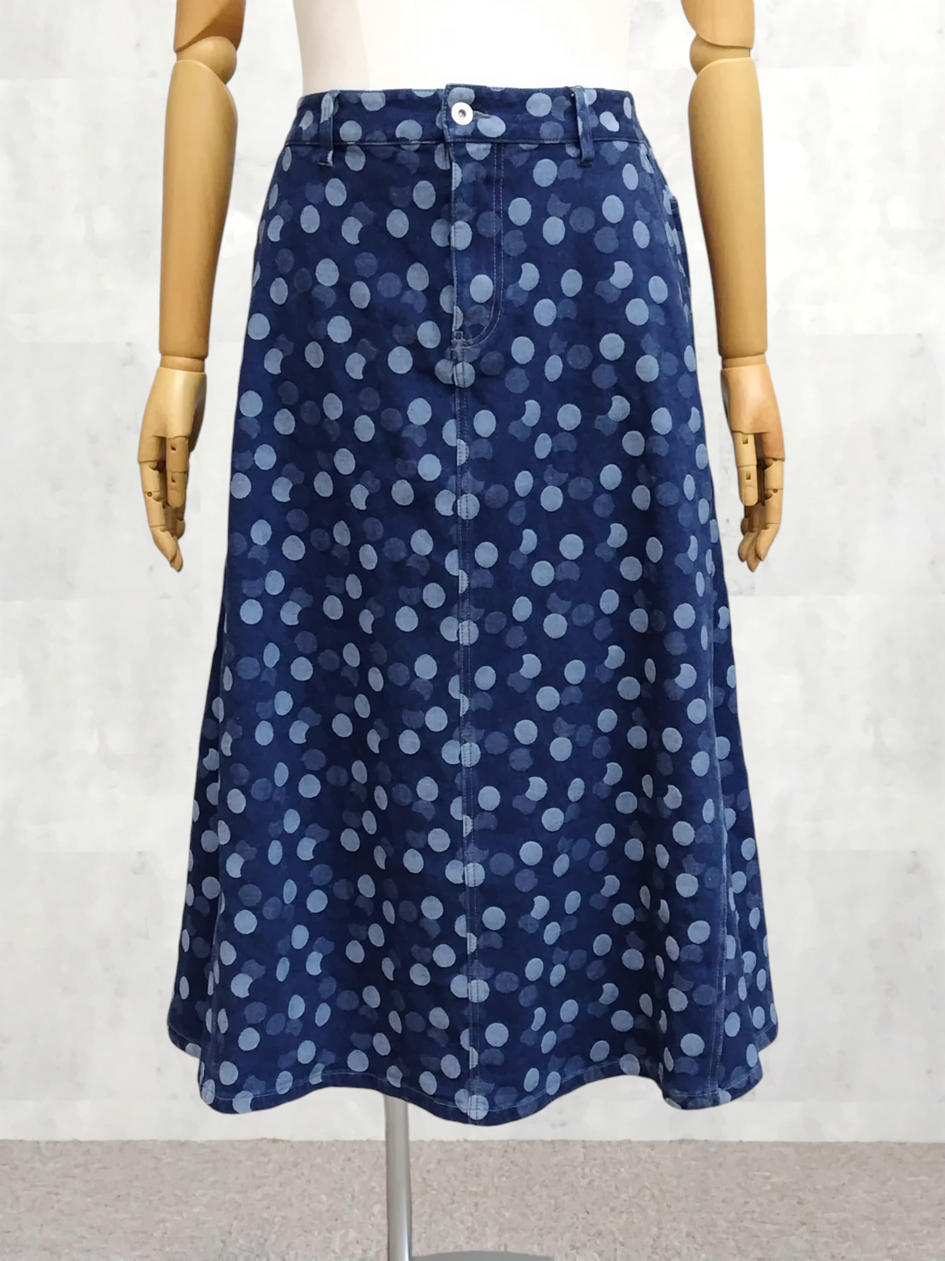 柔らかさと程よい伸縮性を両立した水玉柄デニムスカート。