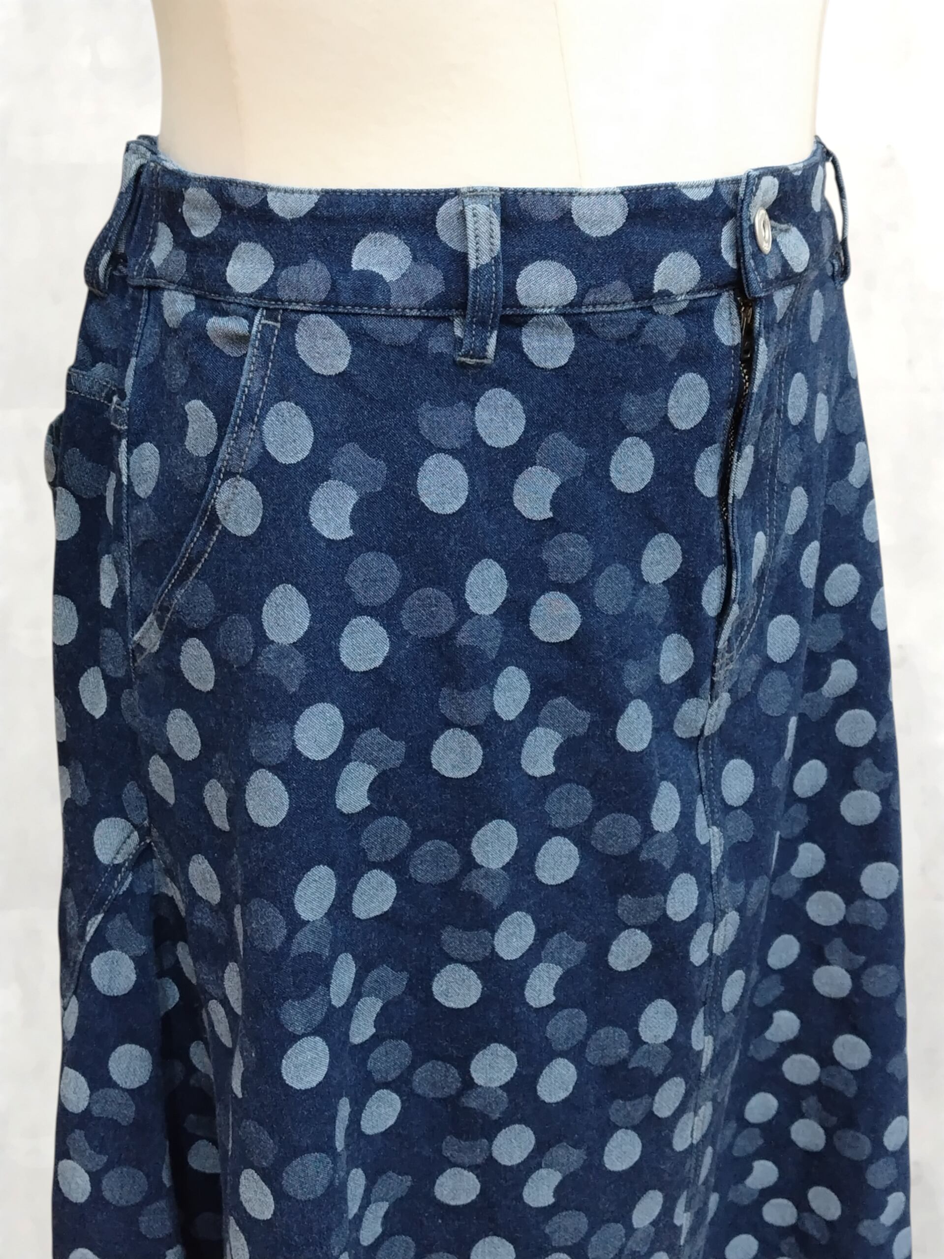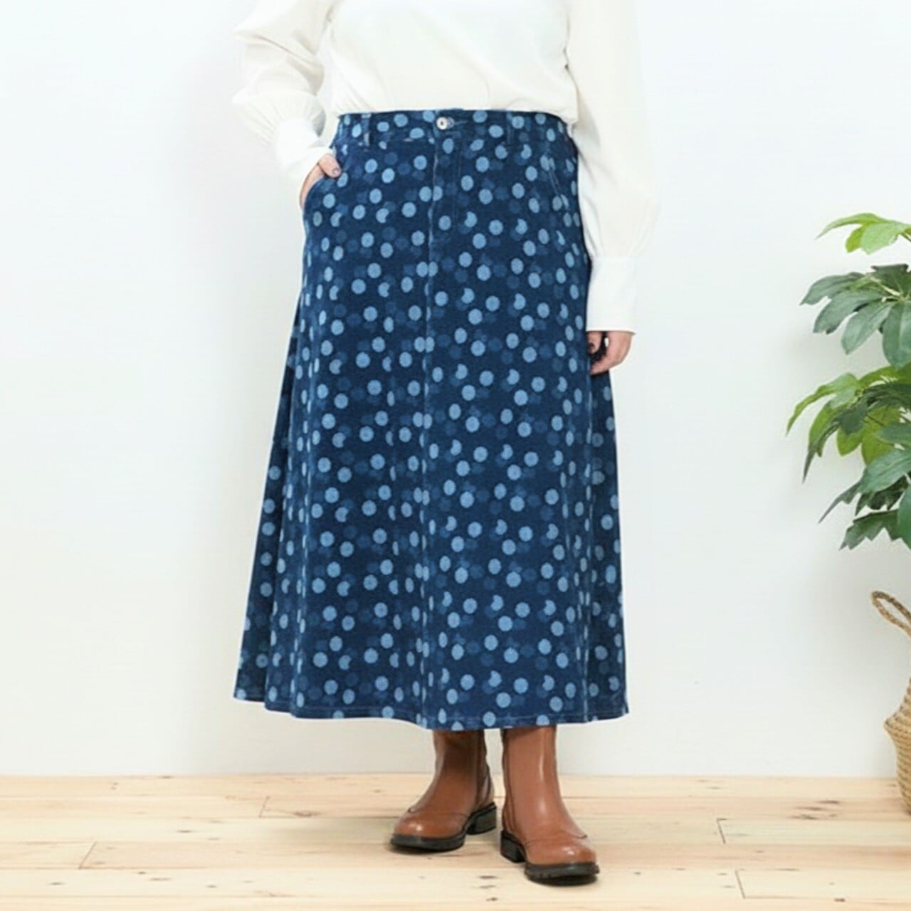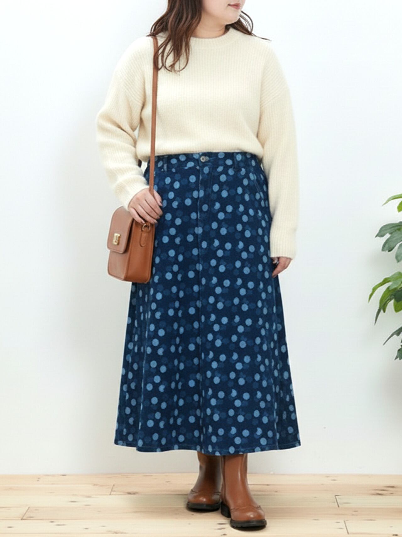 柔らかさと程よい伸縮性を両立した水玉柄デニムスカート。