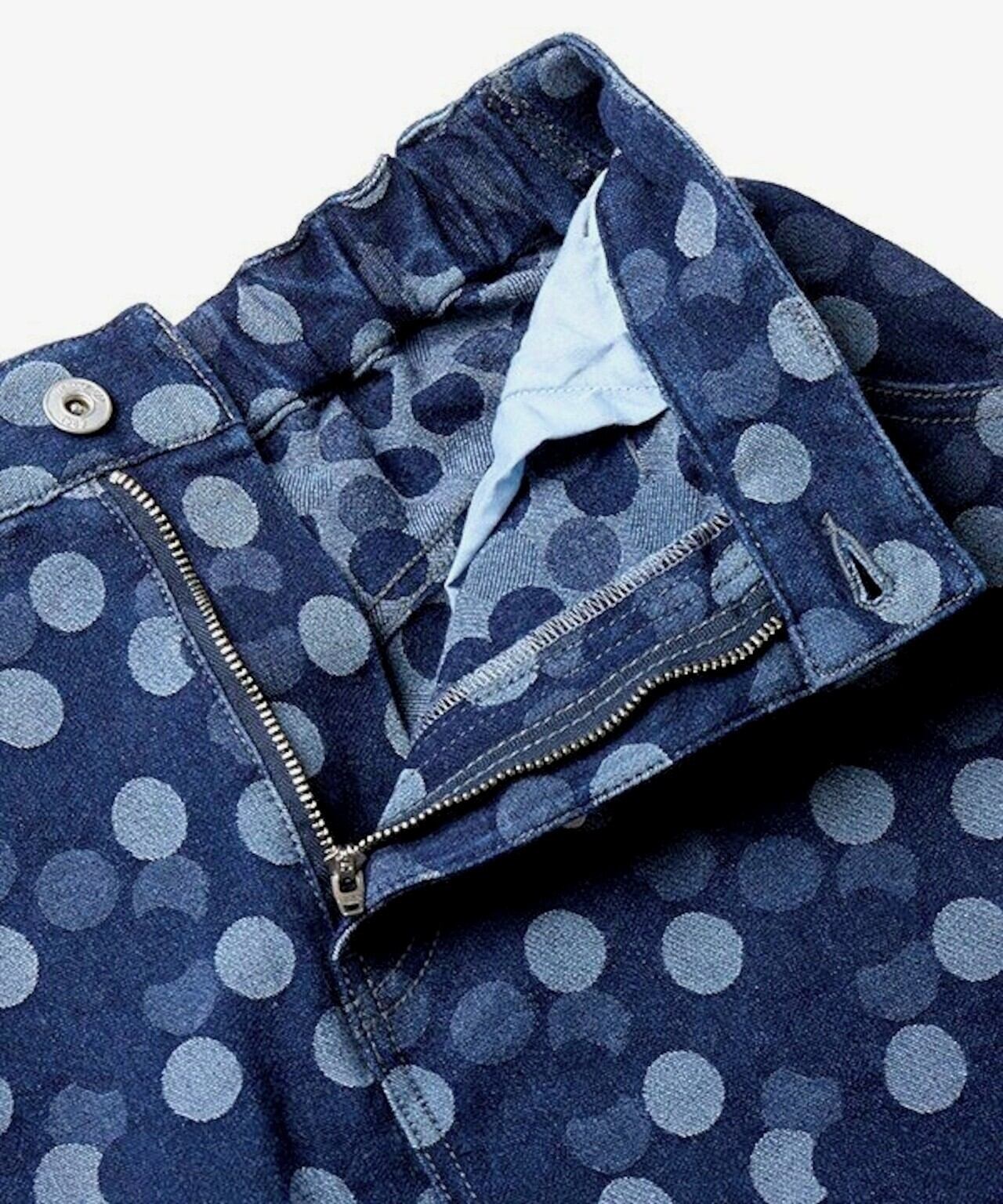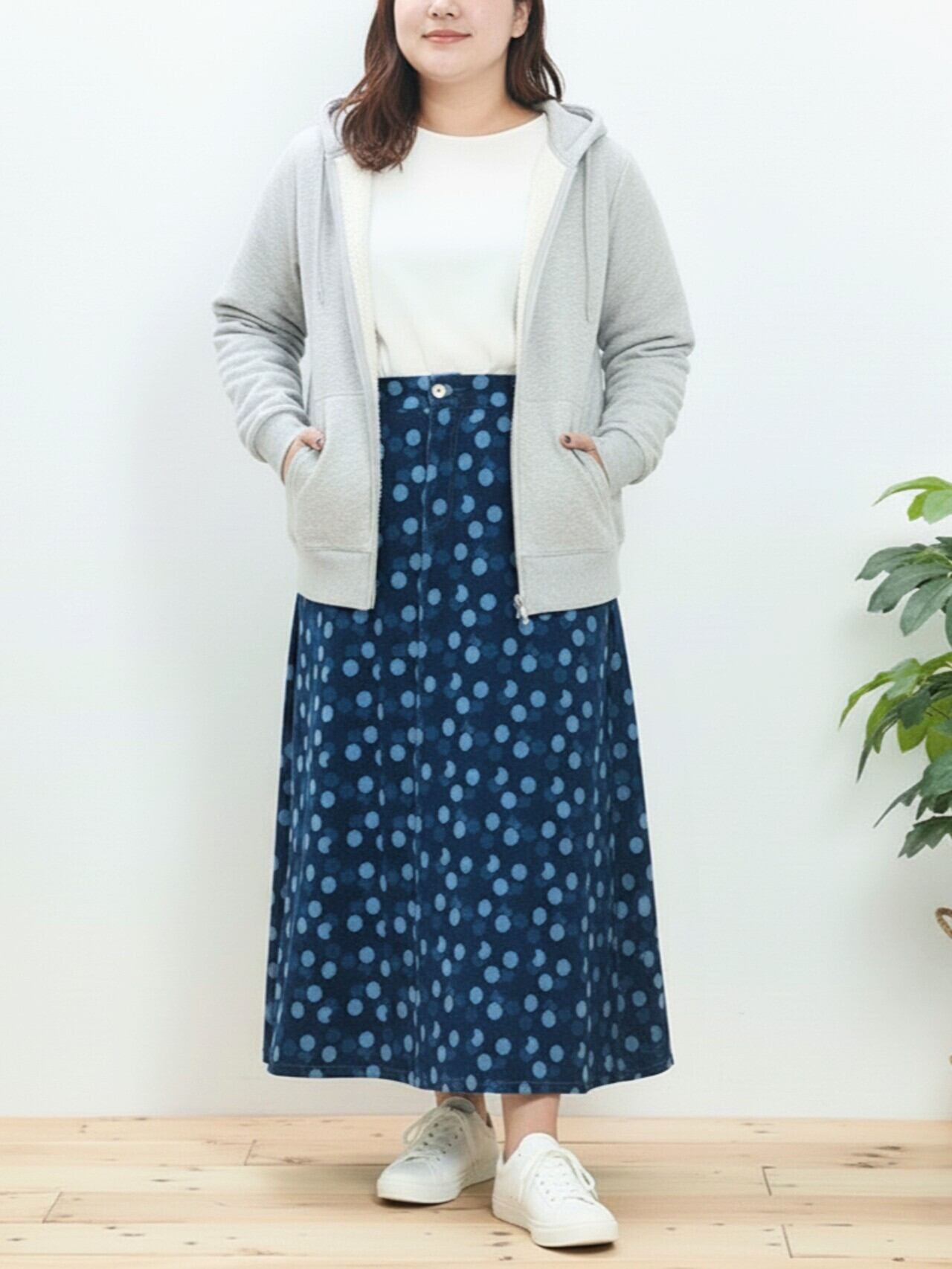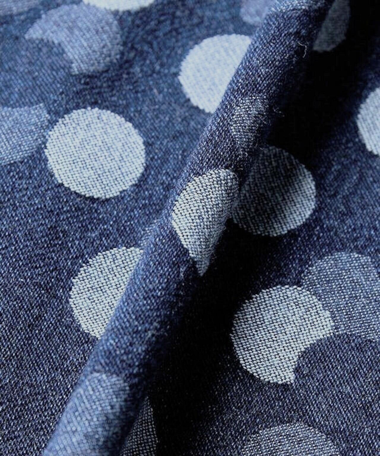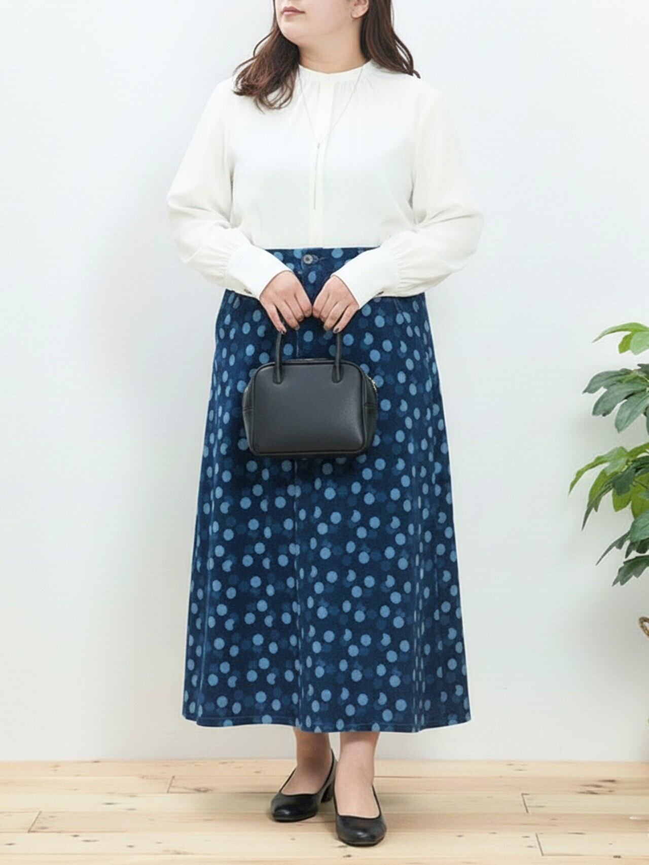 柔らかさと程よい伸縮性を両立した水玉柄デニムスカート。