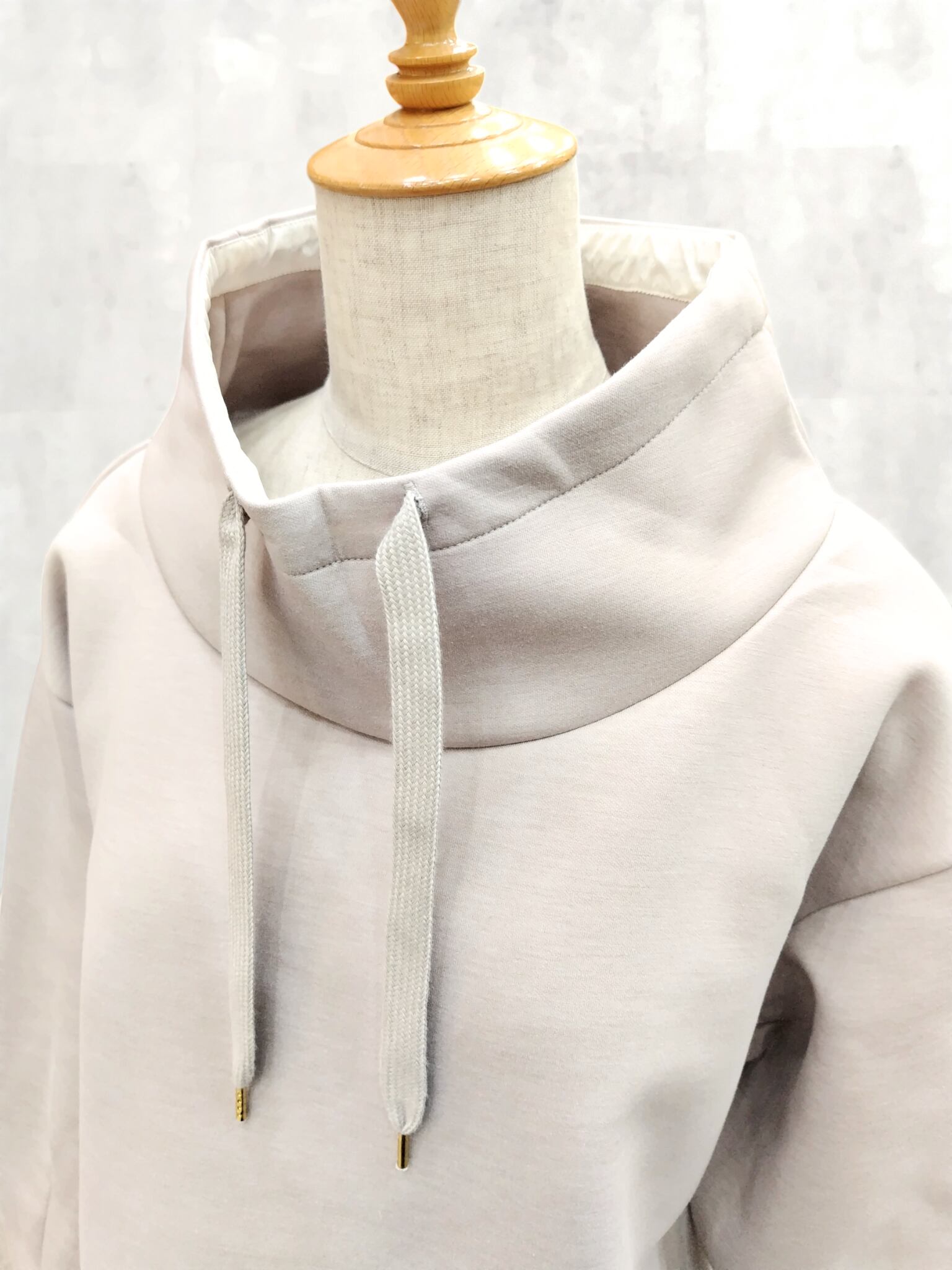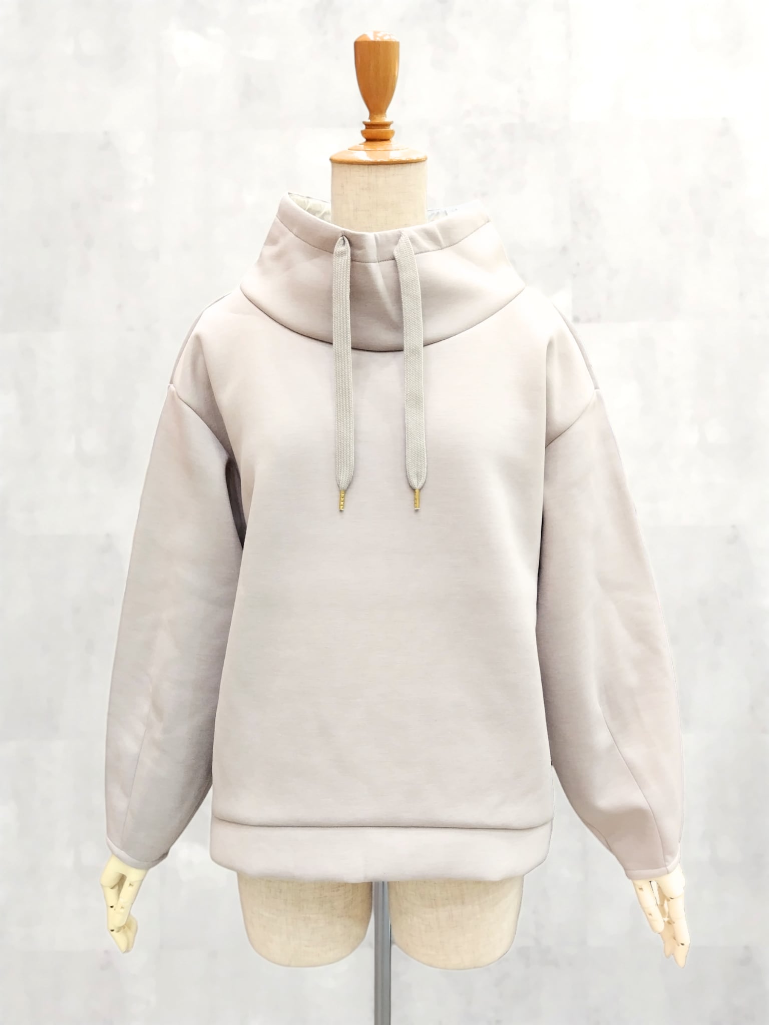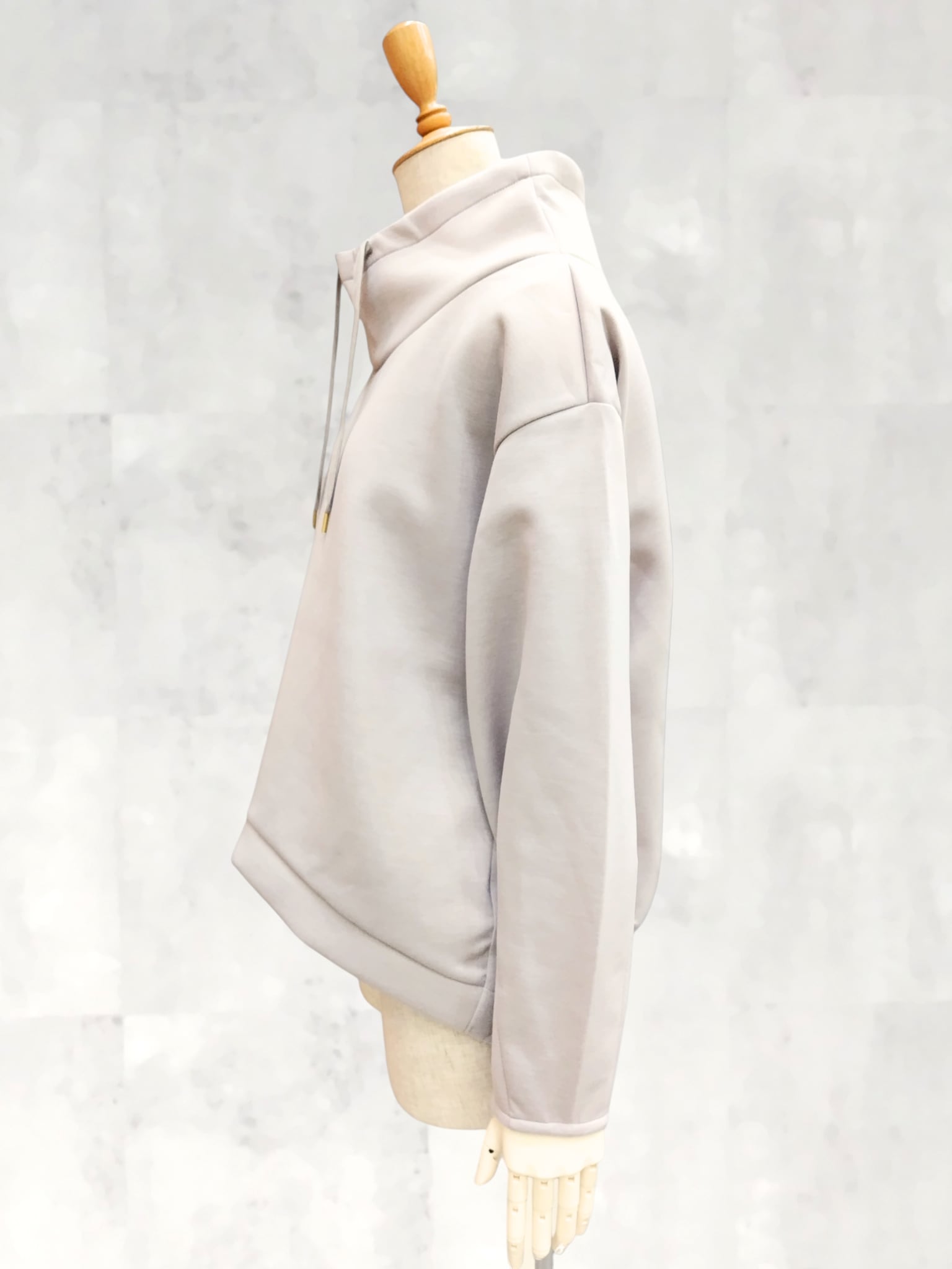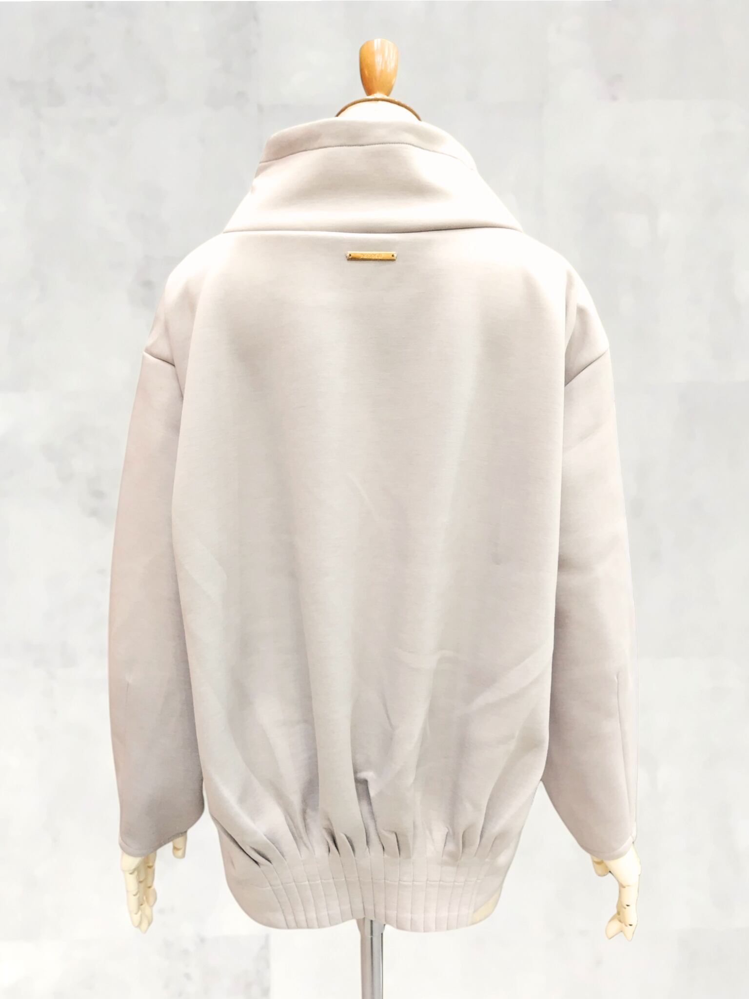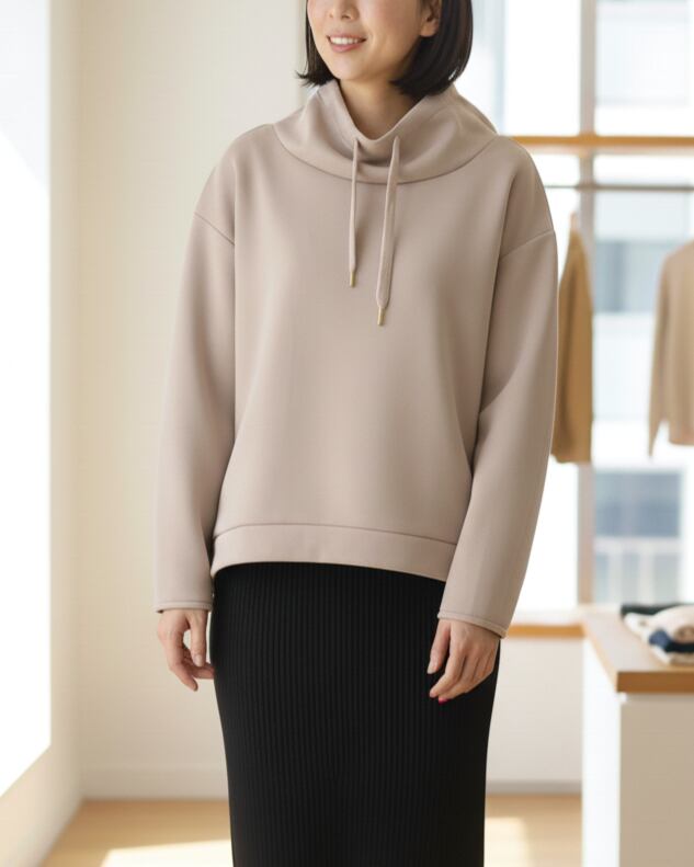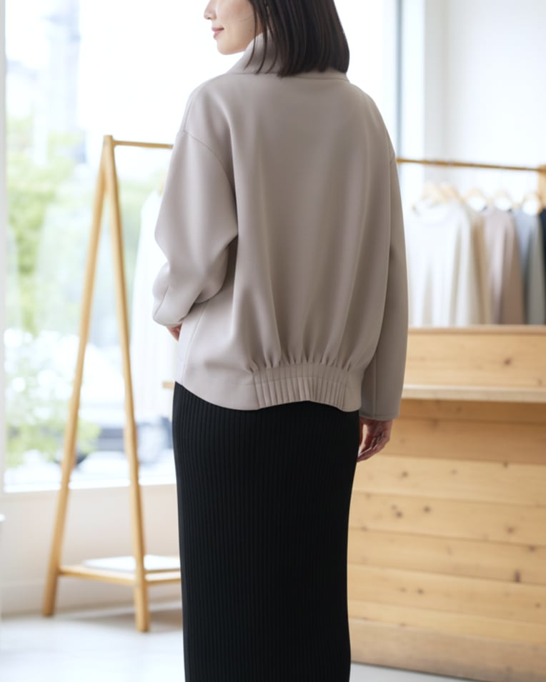 フーディライクなスタンド衿が顔まわりをすっきりと見せ、大人のカジュアルスタイルに程よい抜け感をプラスします。