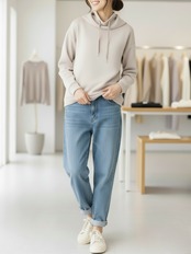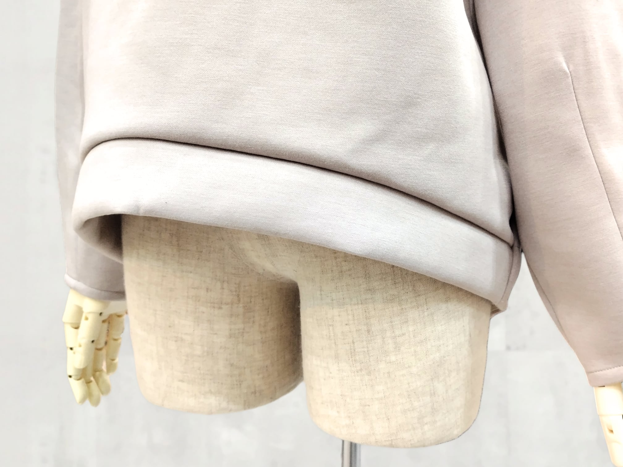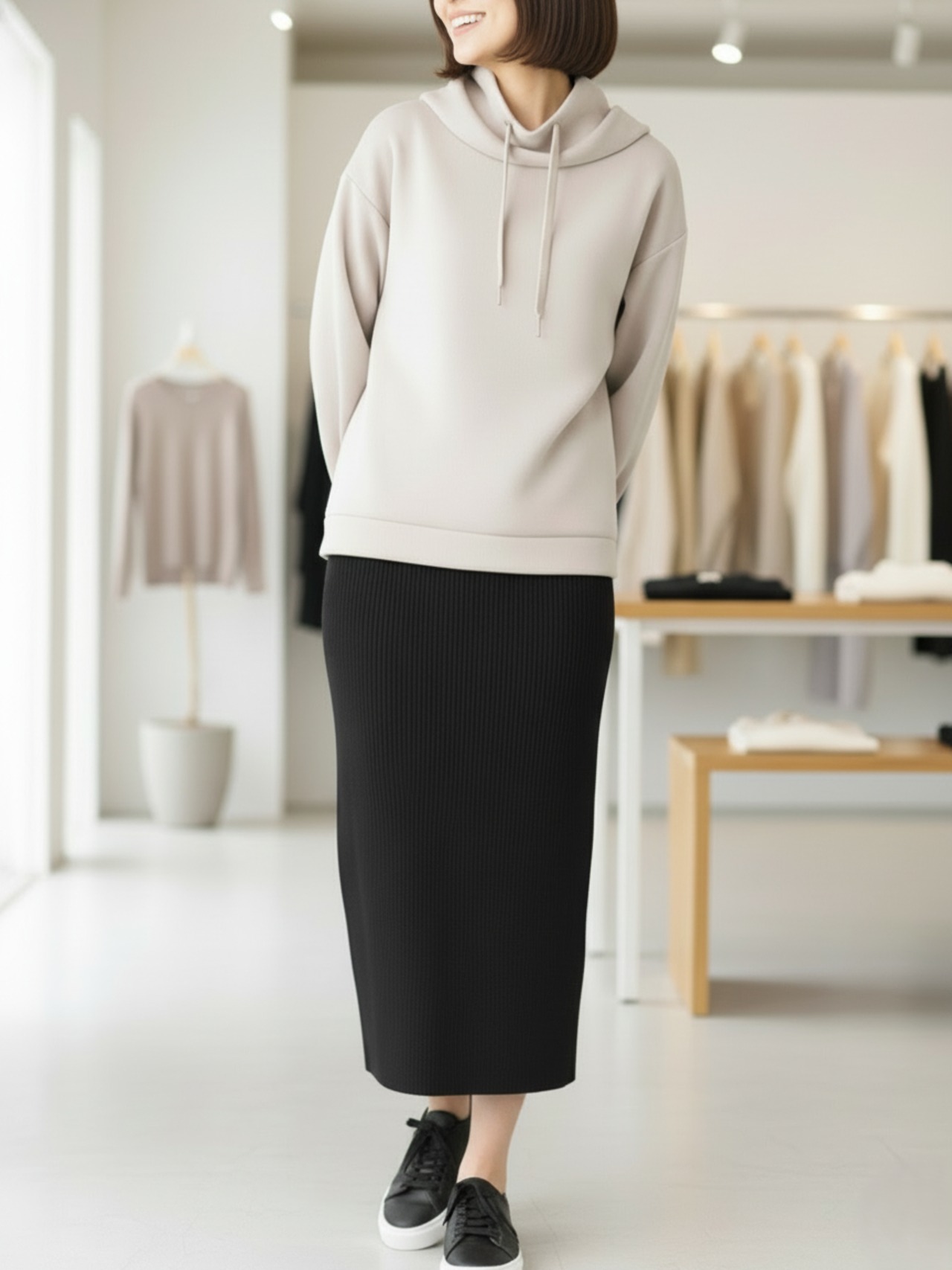 ラウンドした裾が腰まわりを自然にカバーしてくれるため、体型を選ばず着用いただけます。