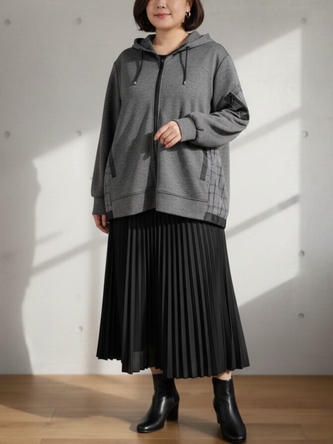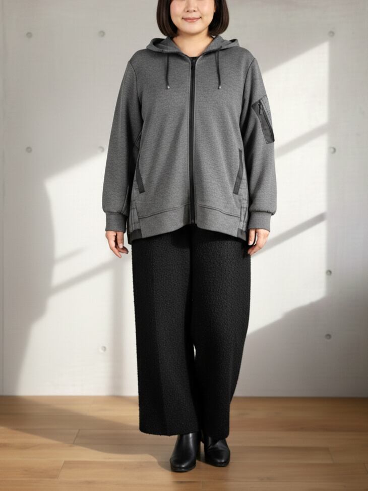 ヒップにかかる丈感で体型を自然にカバーしつつ、パンツにもスカートにも合わせやすい万能さ。