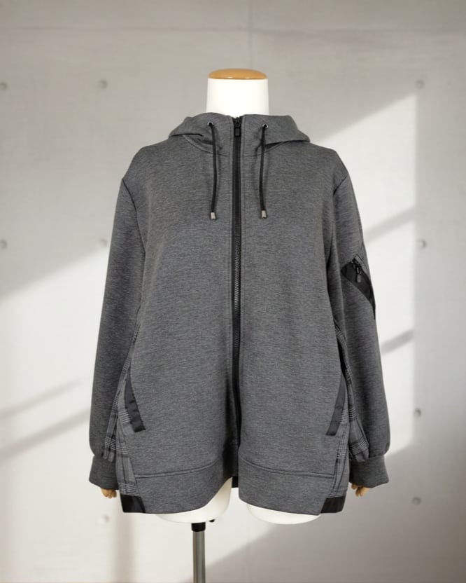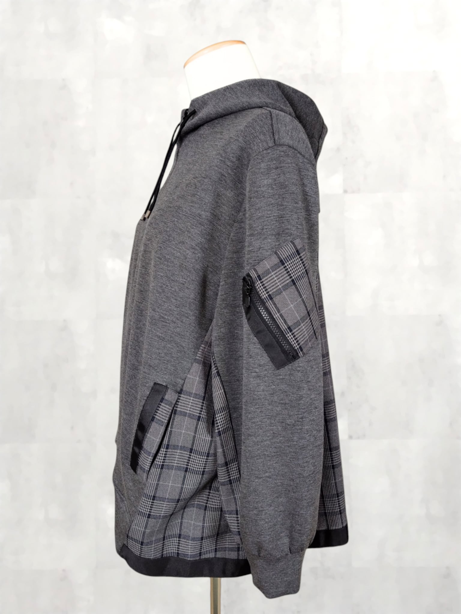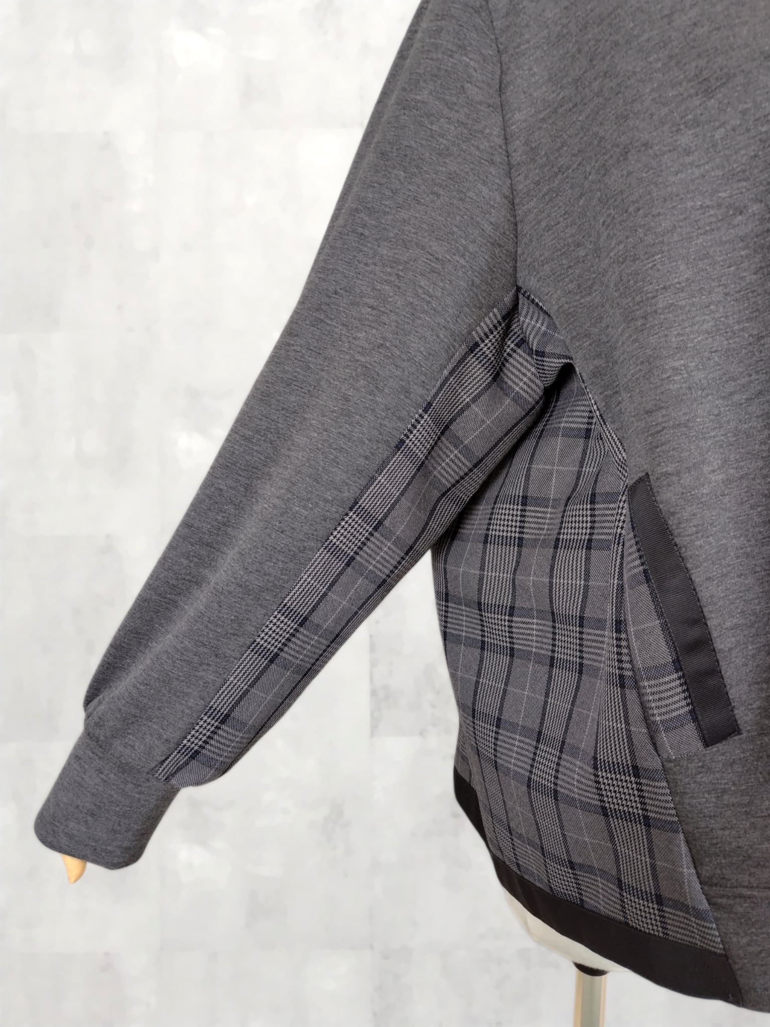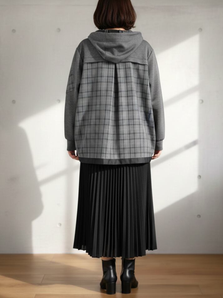 無地とチェックを組み合わせたドッキングデザインは、着るだけで程よいアクセントに。