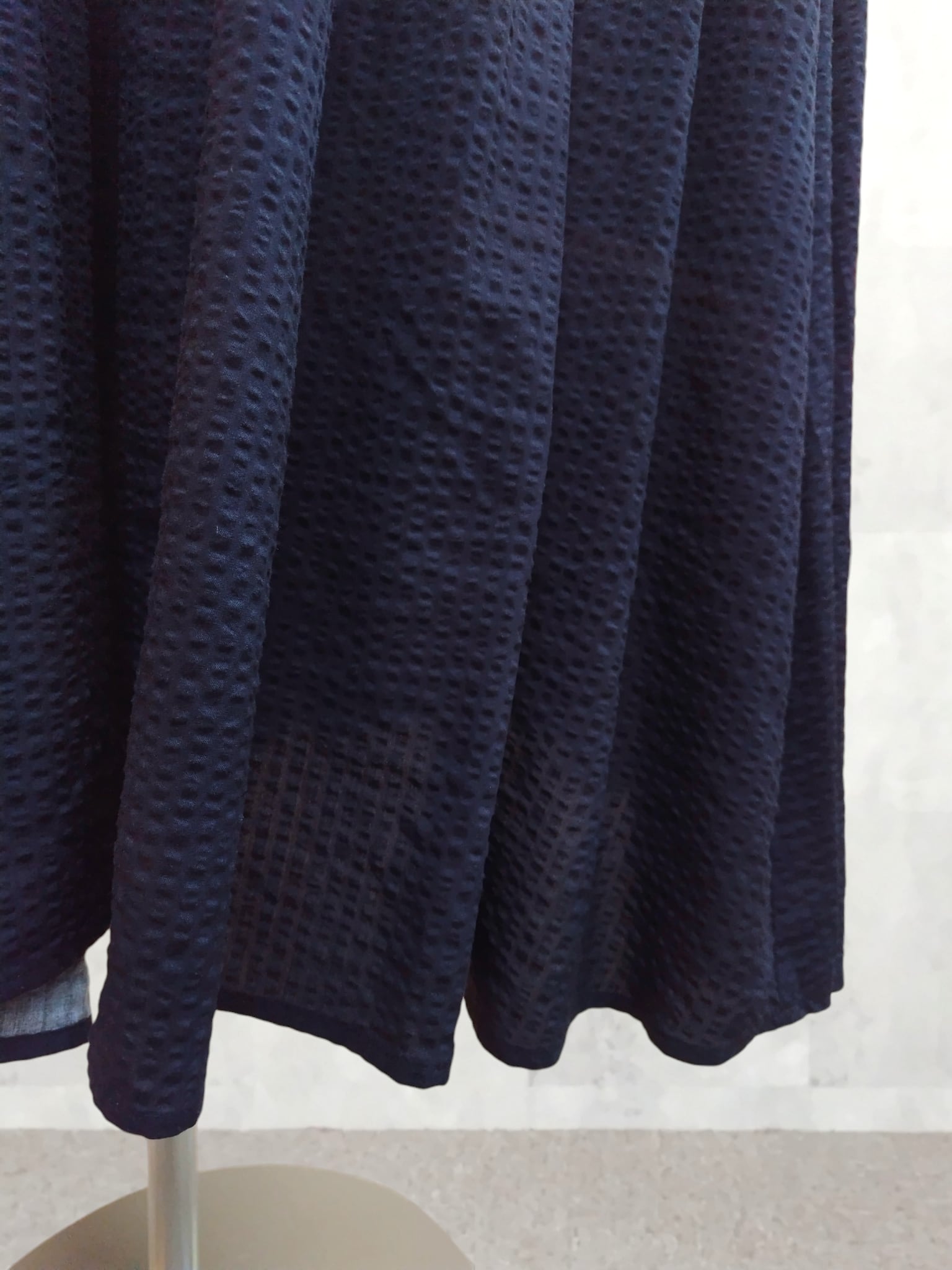 やさしい落ち感とポコポコとした表情のある素材は、身体のラインを強調せず、でもだらしなく見えない。