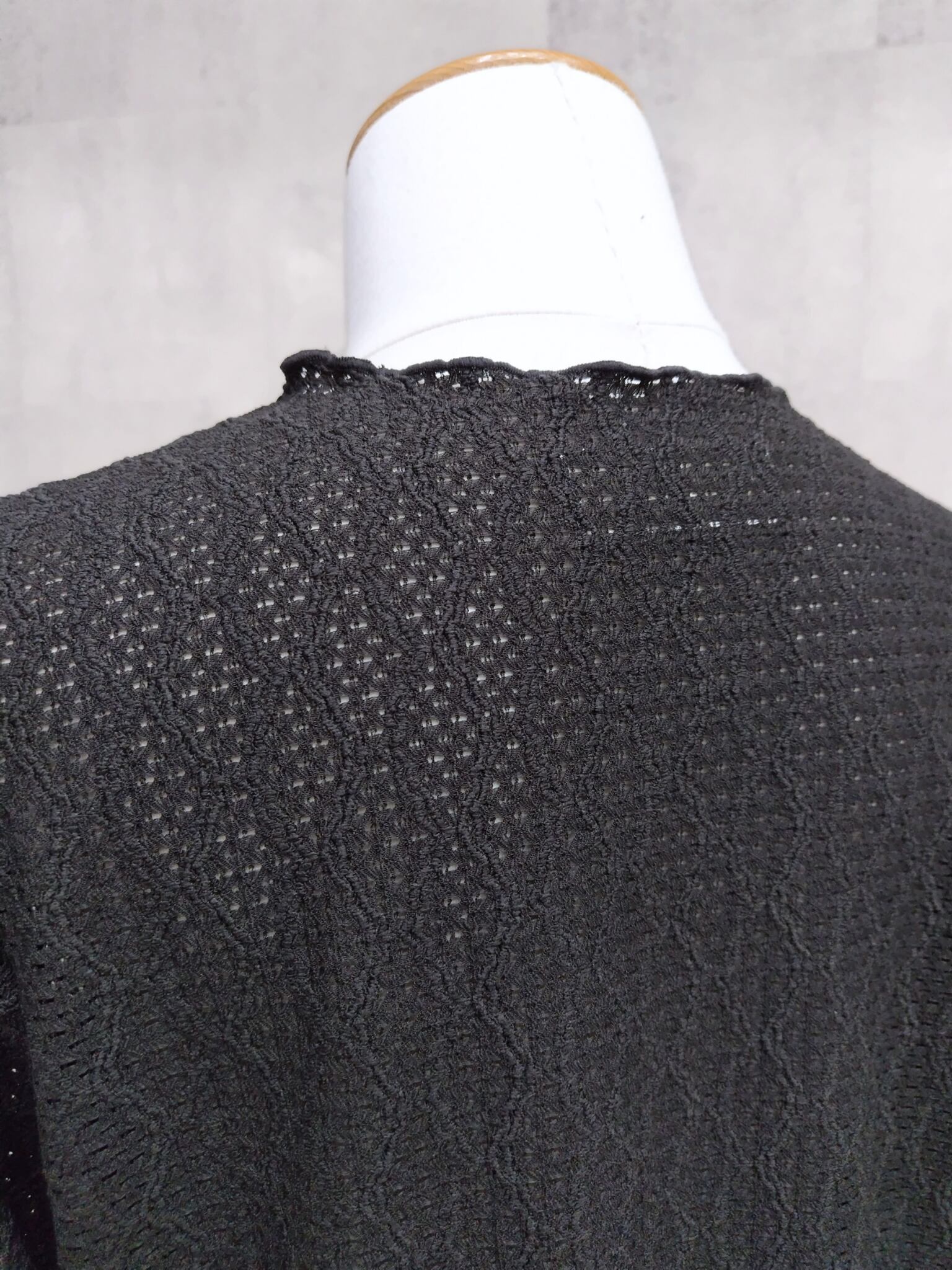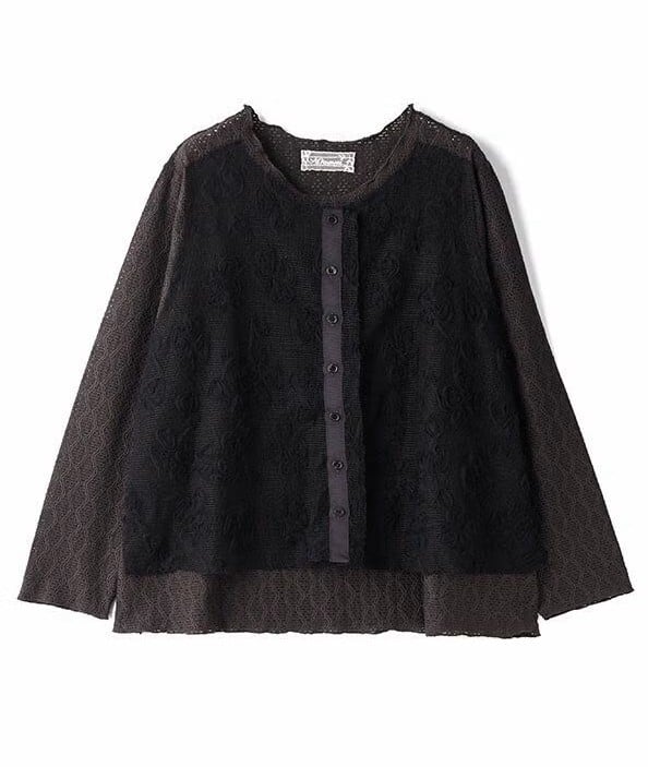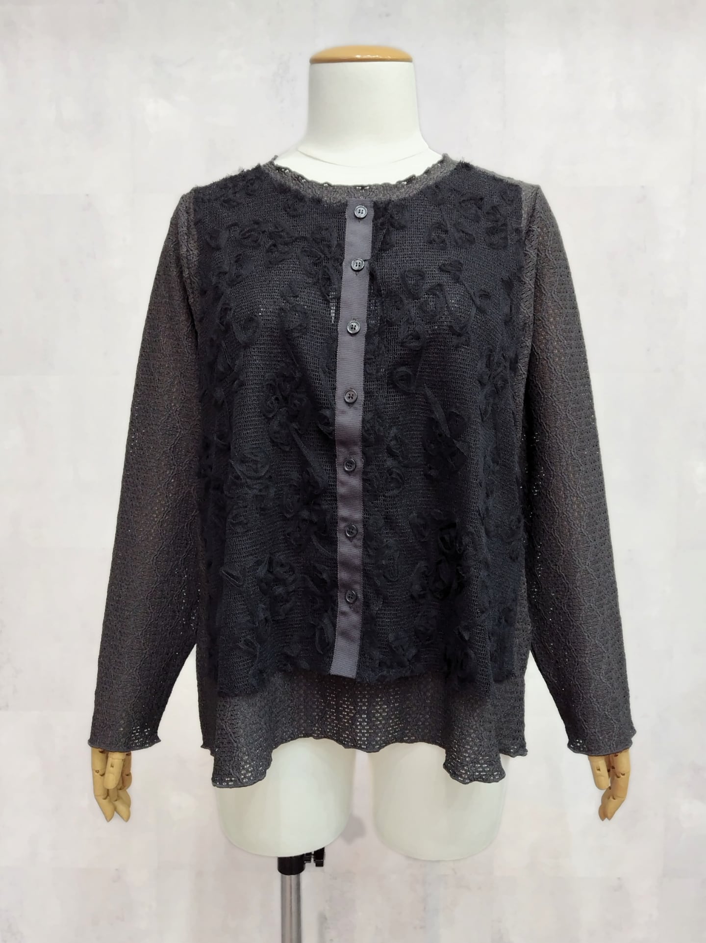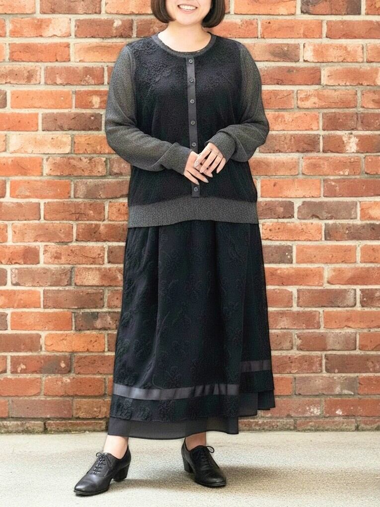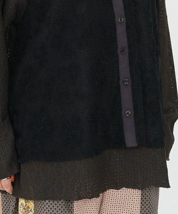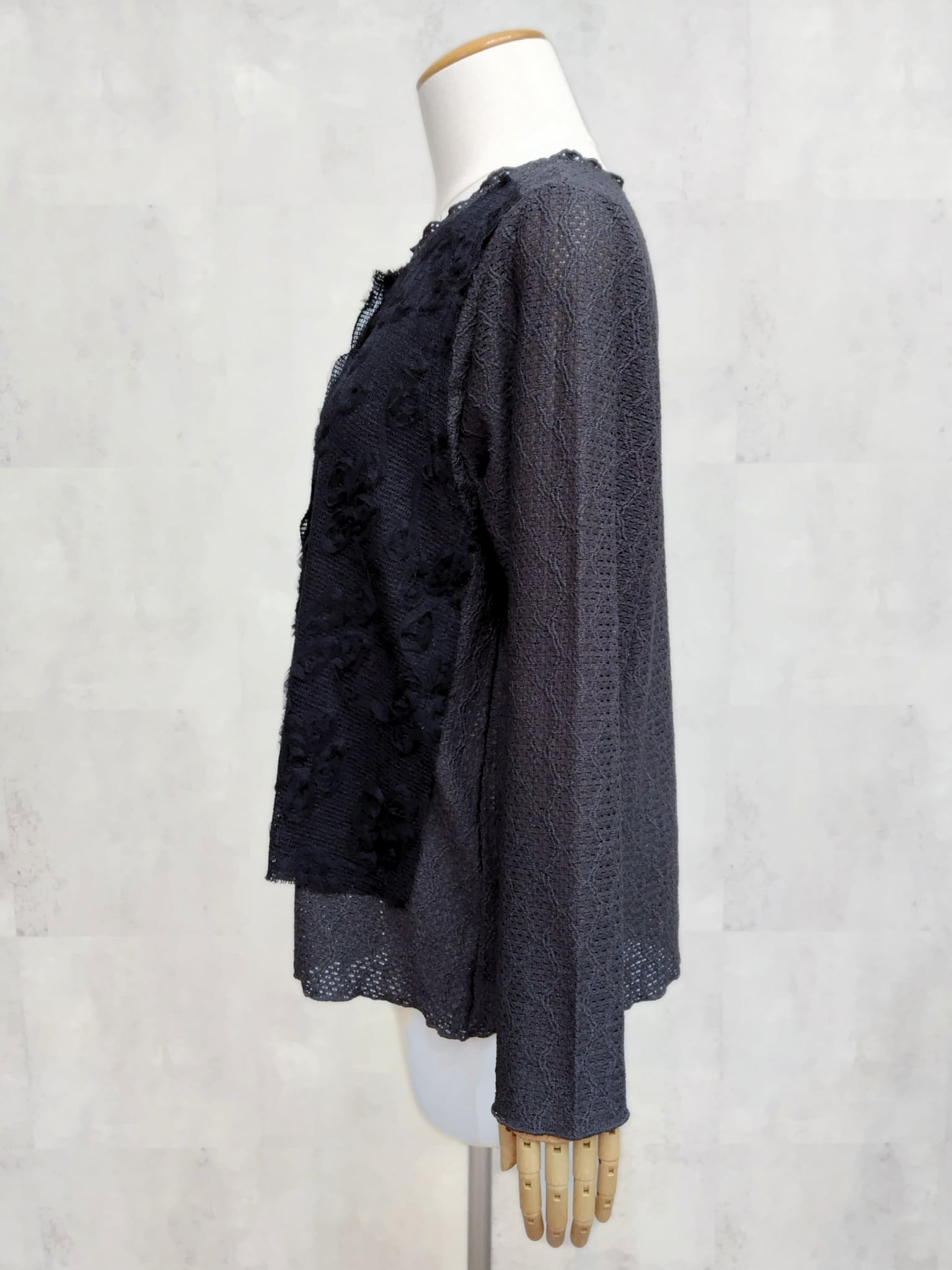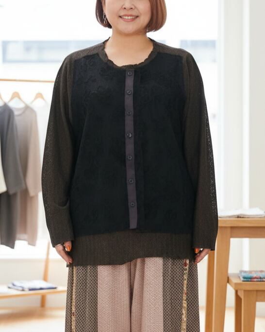 レースベストを重ねたように見えるデザインで、重ね着をしなくても奥行きのある装いに。