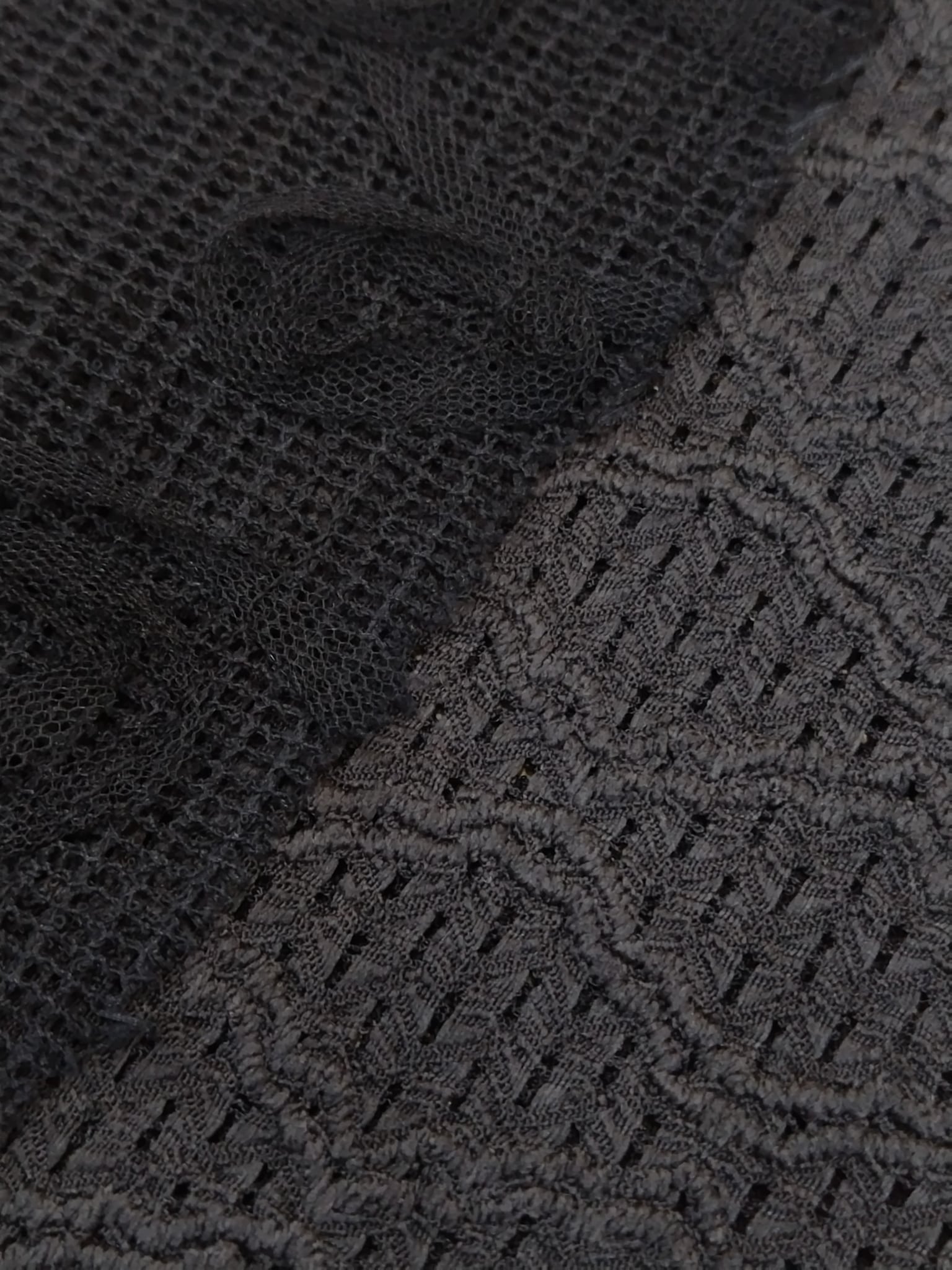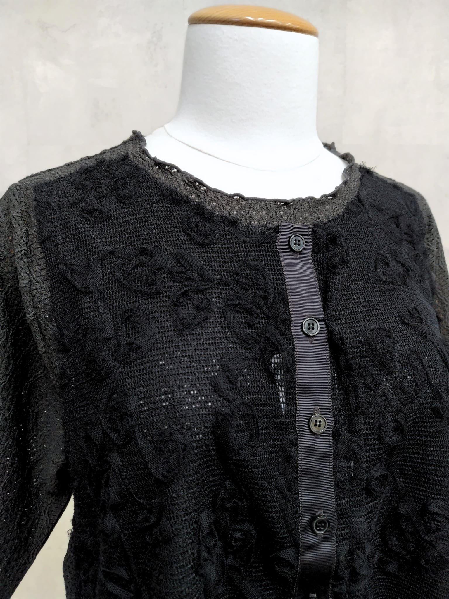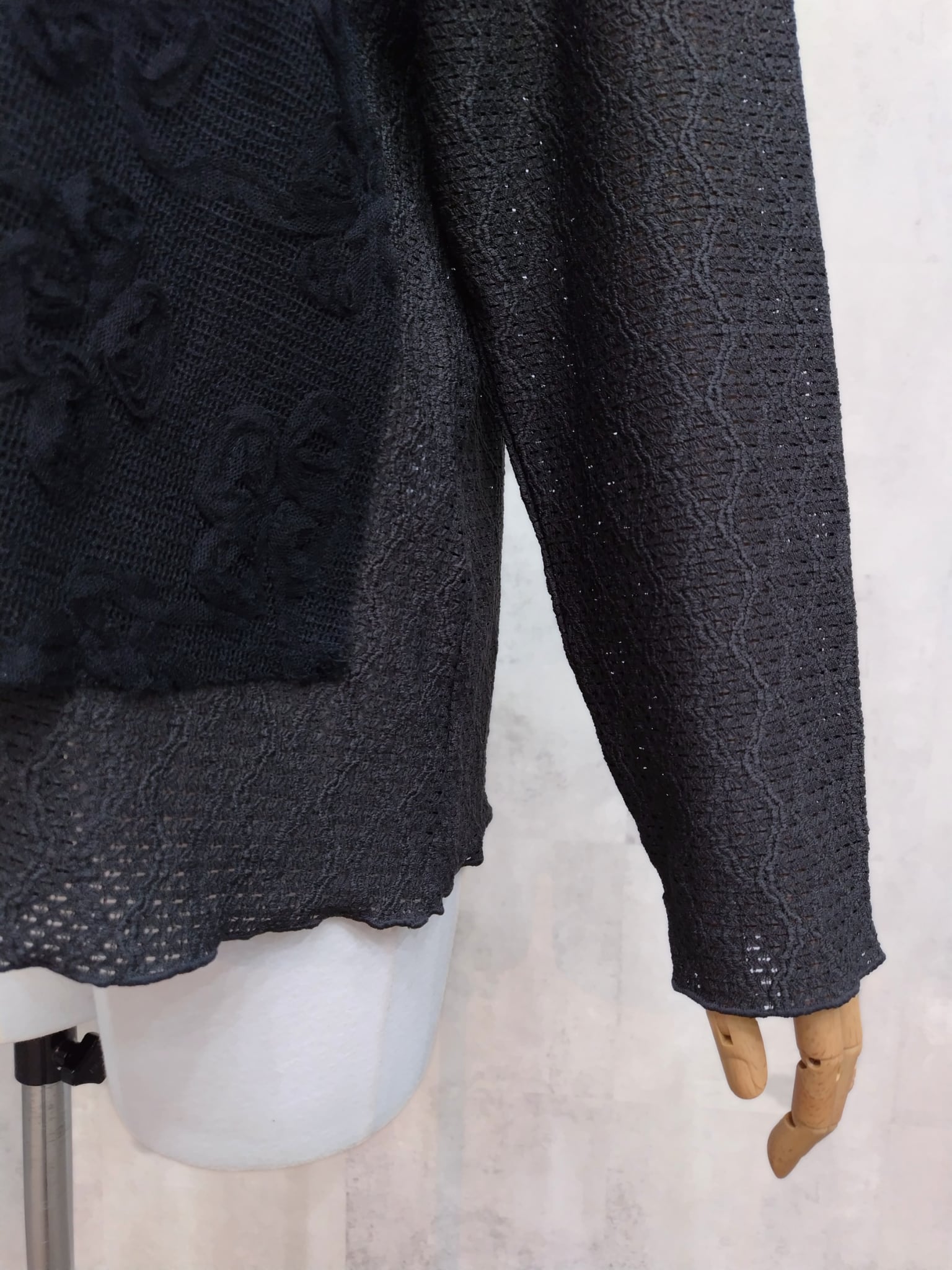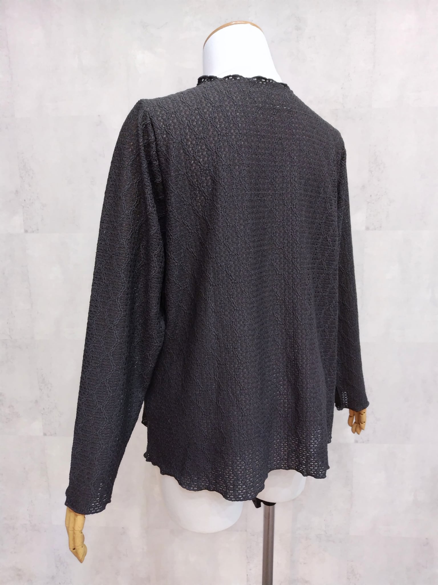 レースベストを重ねたように見えるデザインで、重ね着をしなくても奥行きのある装いに。