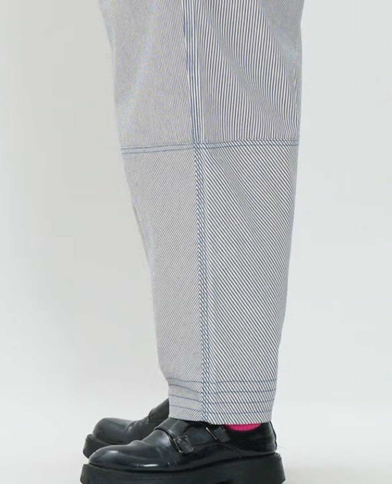 丸みのあるシルエットでも、縦に入ったヒッコリー柄が視線を下へ流し、落ち着いた印象に整えてくれます。