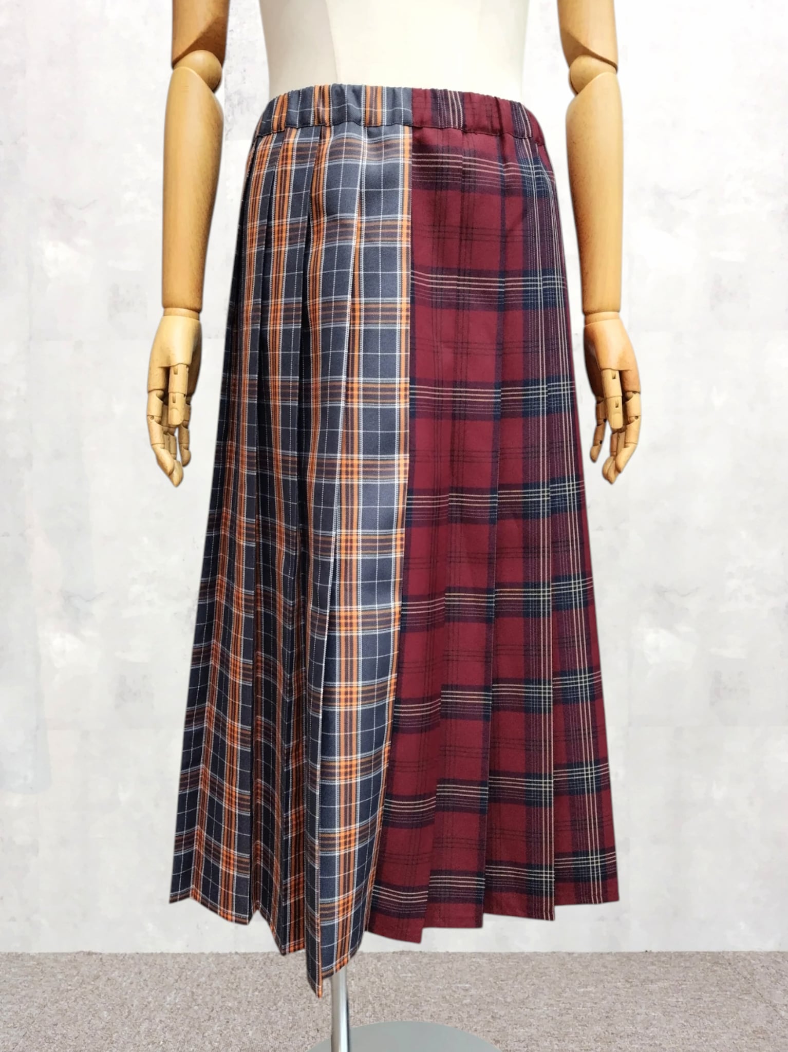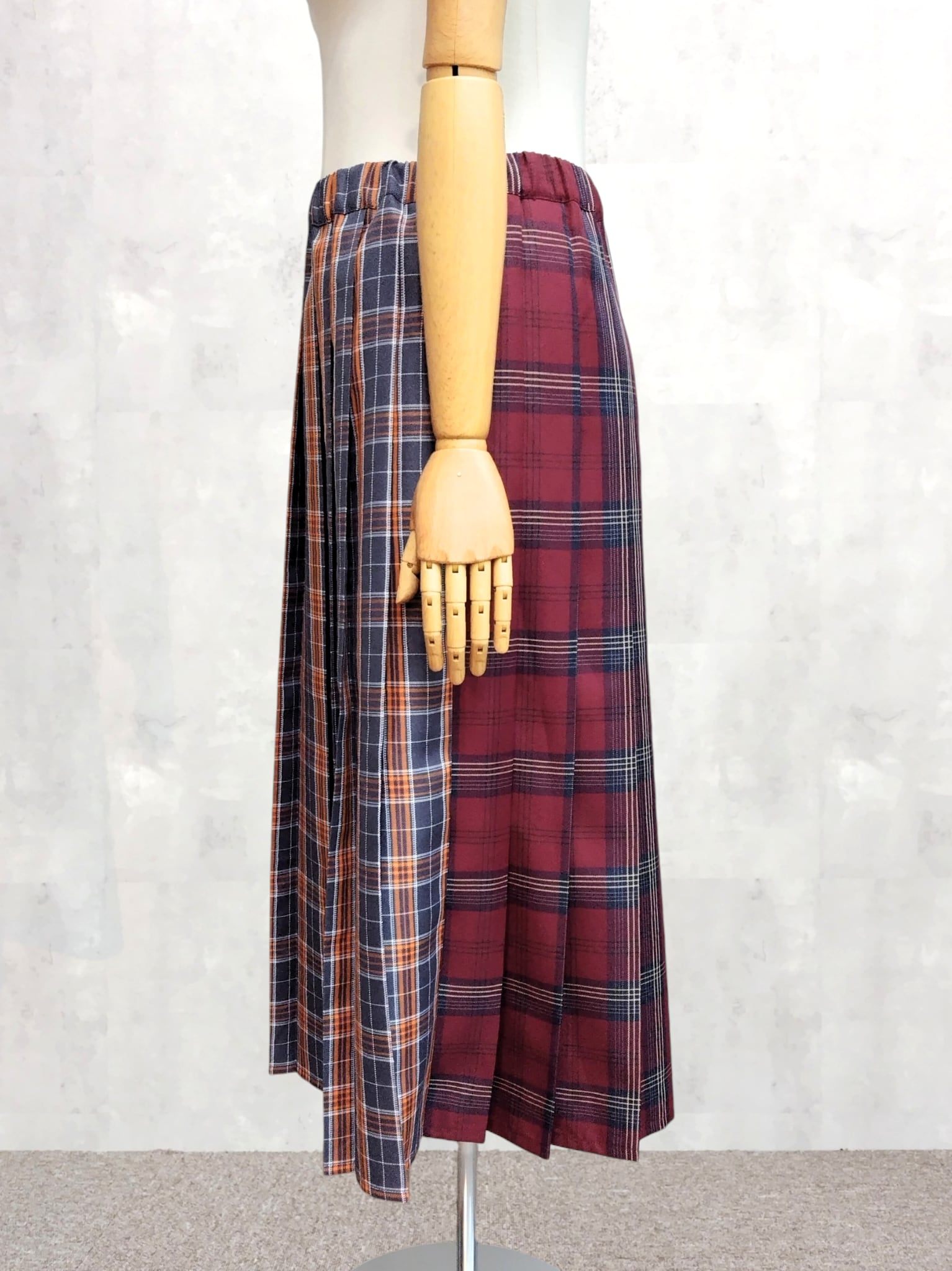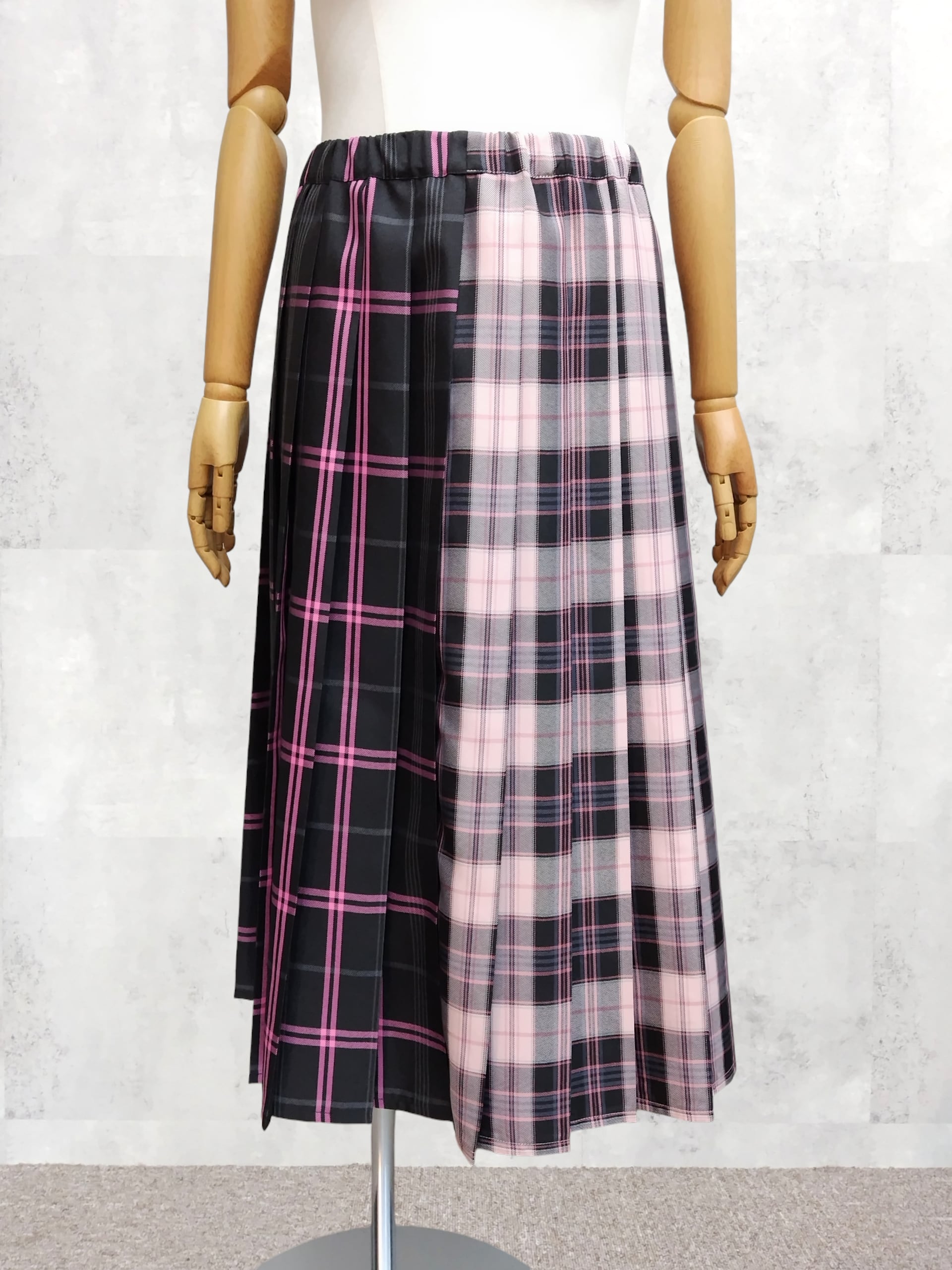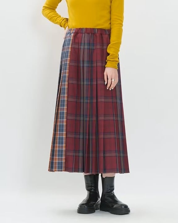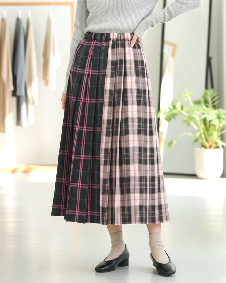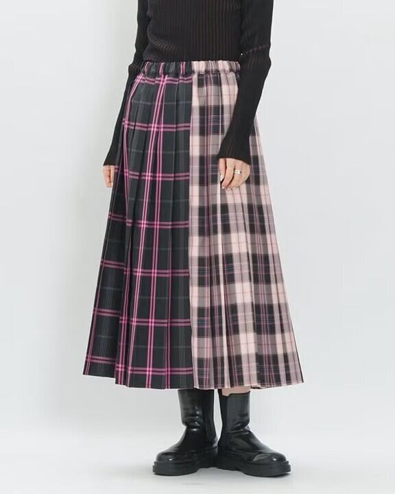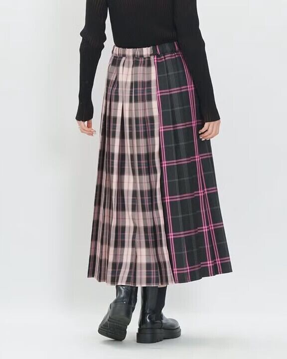 前後で異なる2種類のチェック柄をドッキングしたプリーツスカート。
