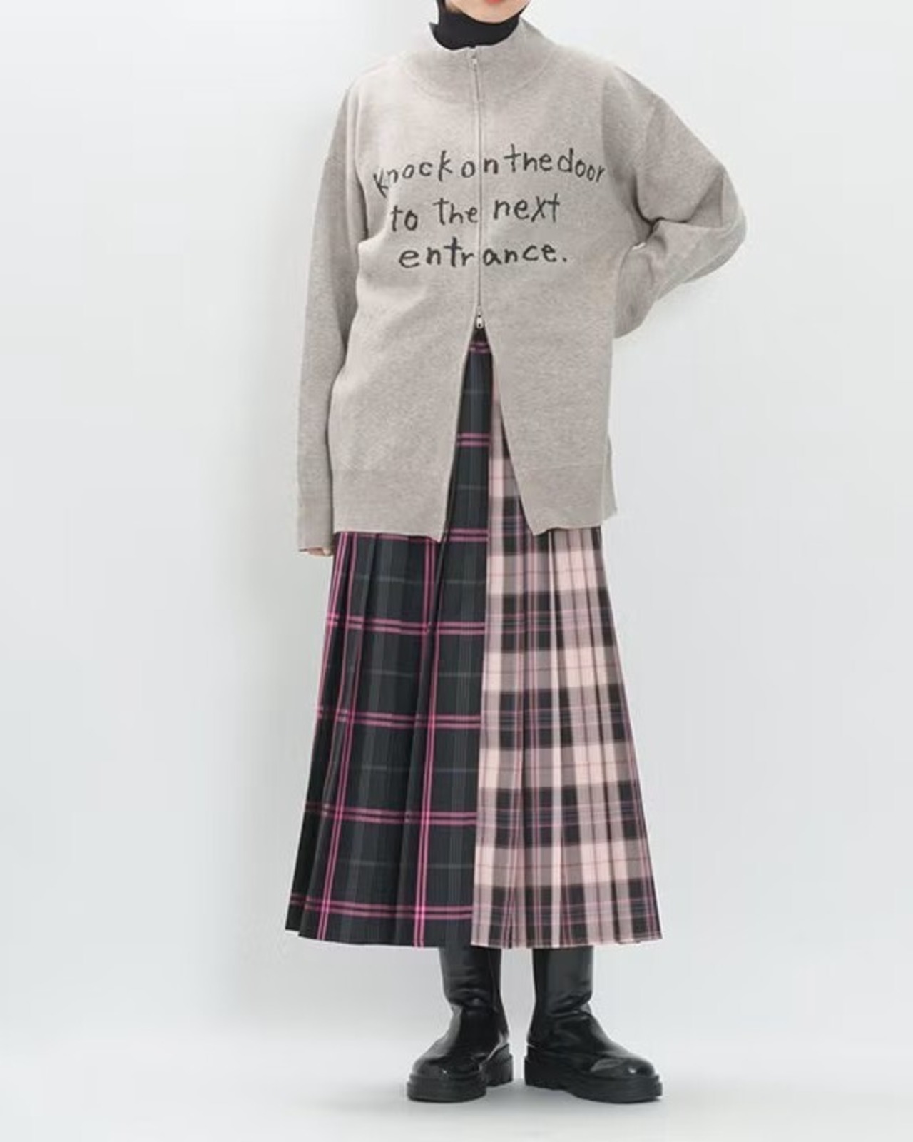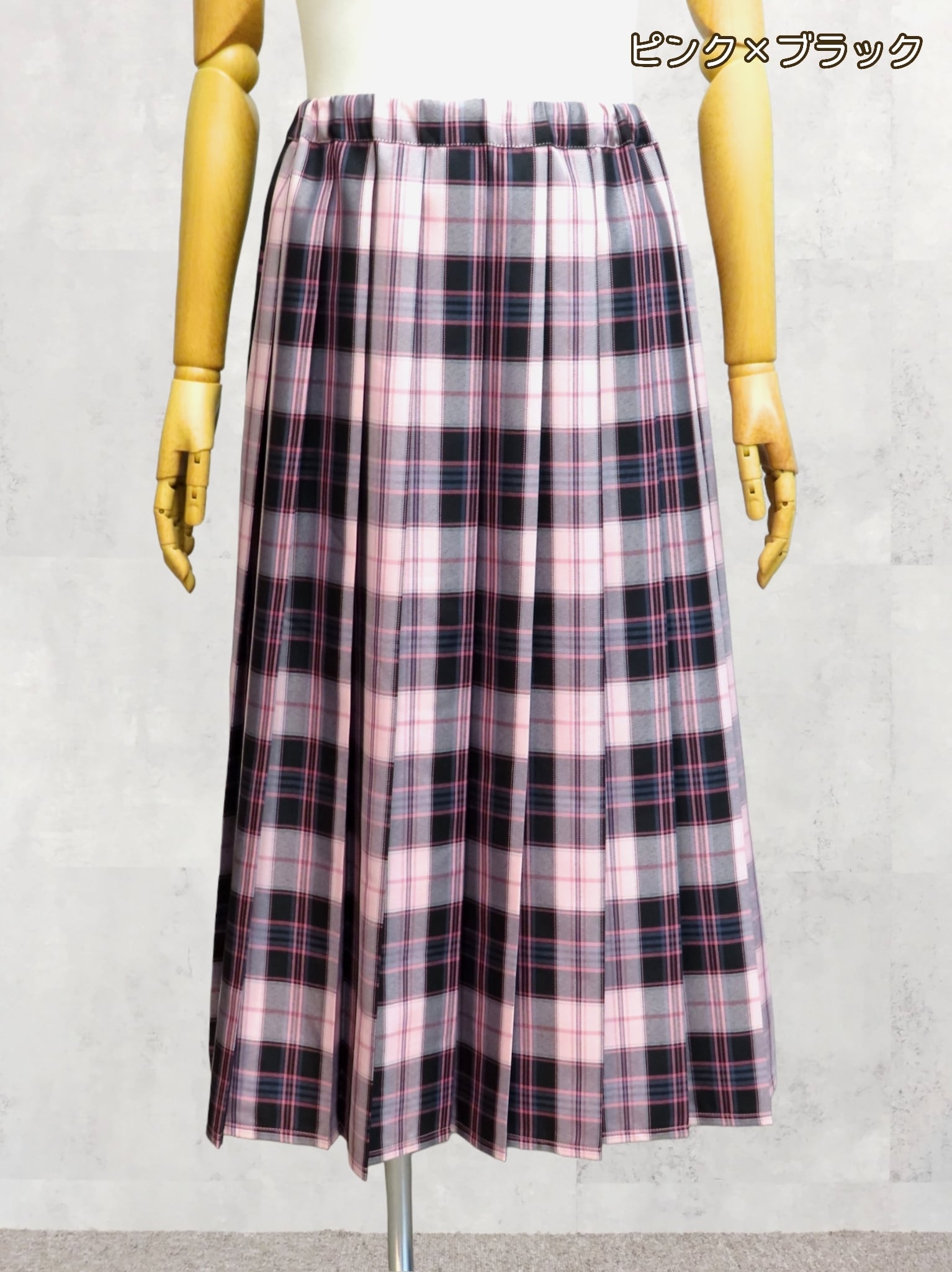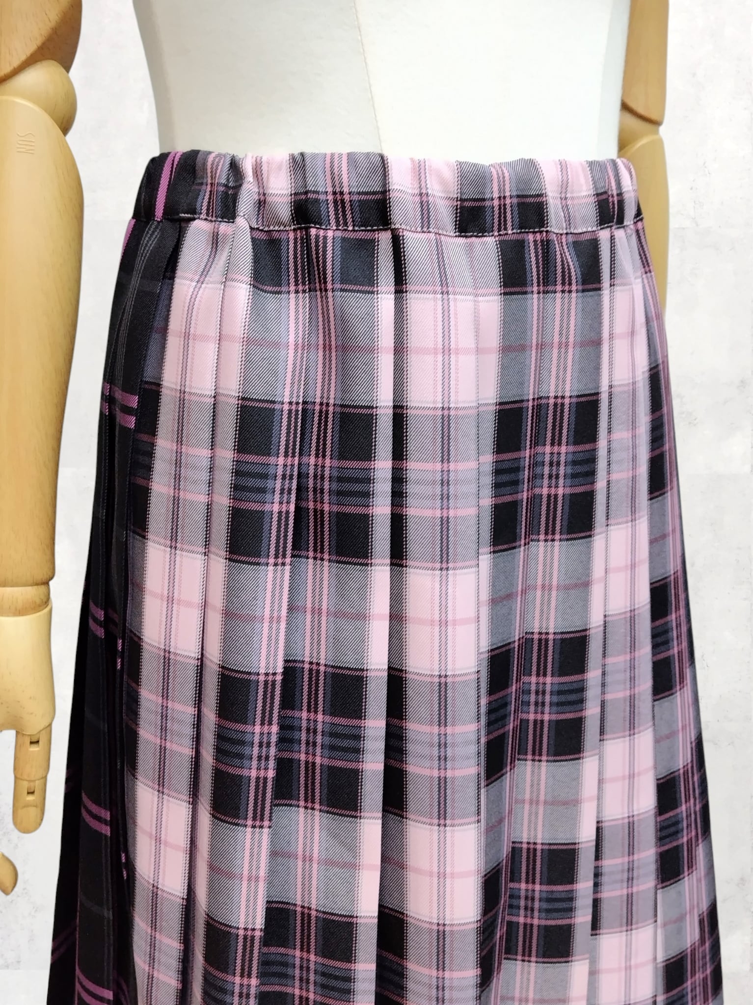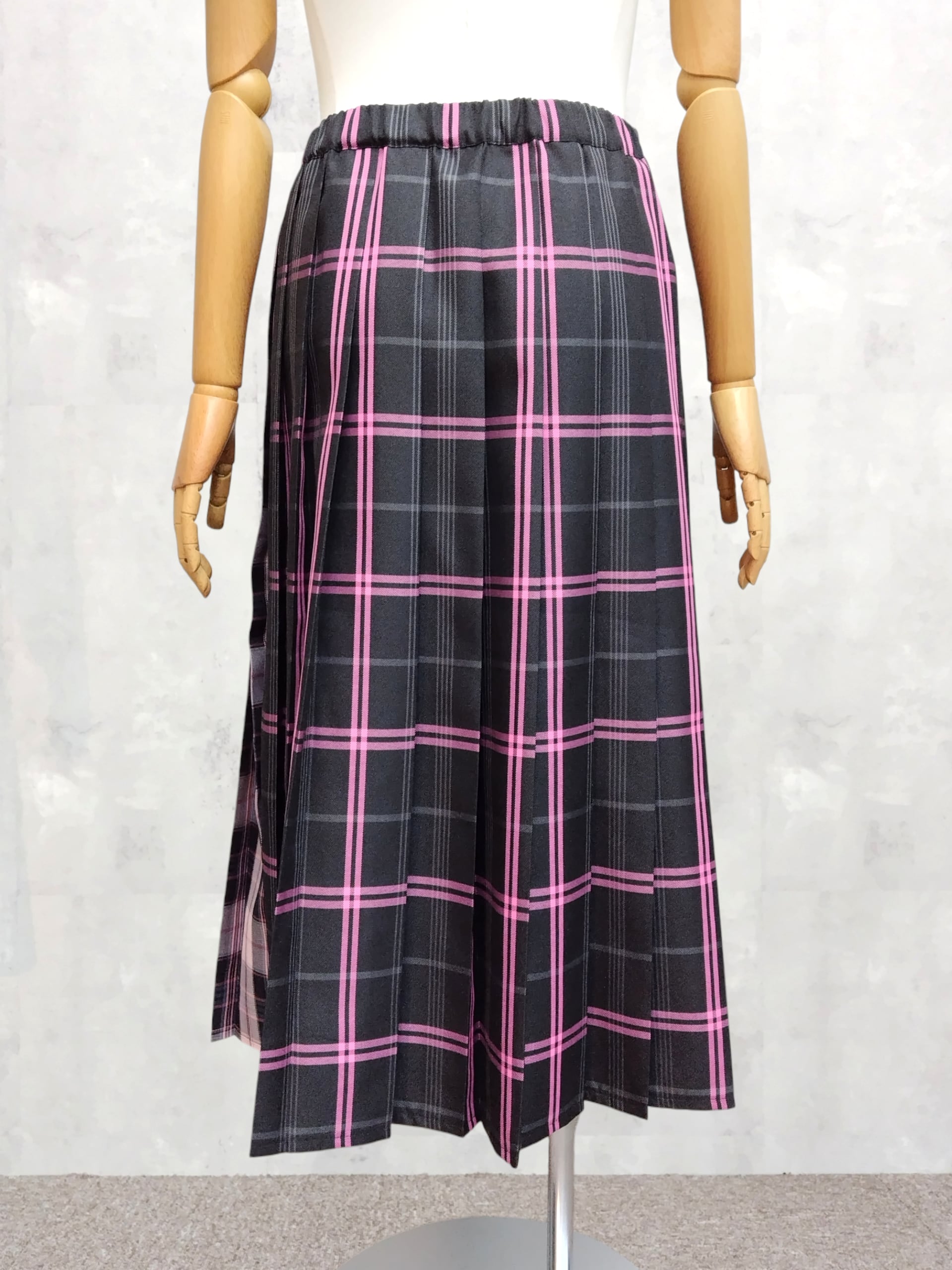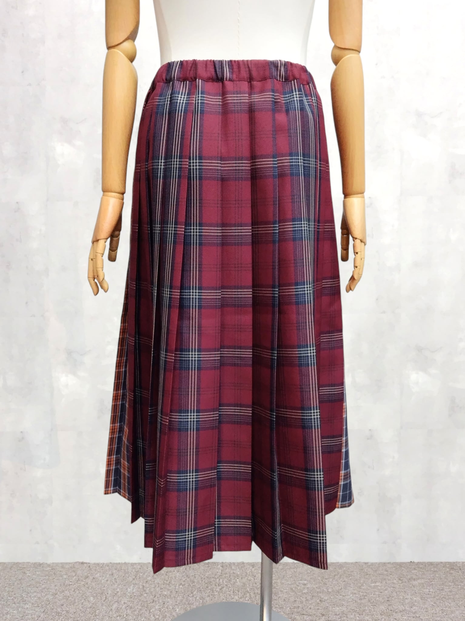 前後で異なる2種類のチェック柄をドッキングしたプリーツスカート。