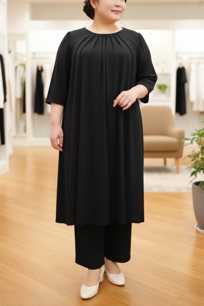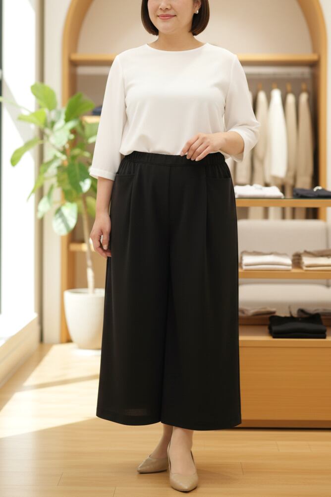 横に広がりすぎないシルエットが、下半身の気になる部分をカバーしつつ、全体をすっきりとまとめてくれます。