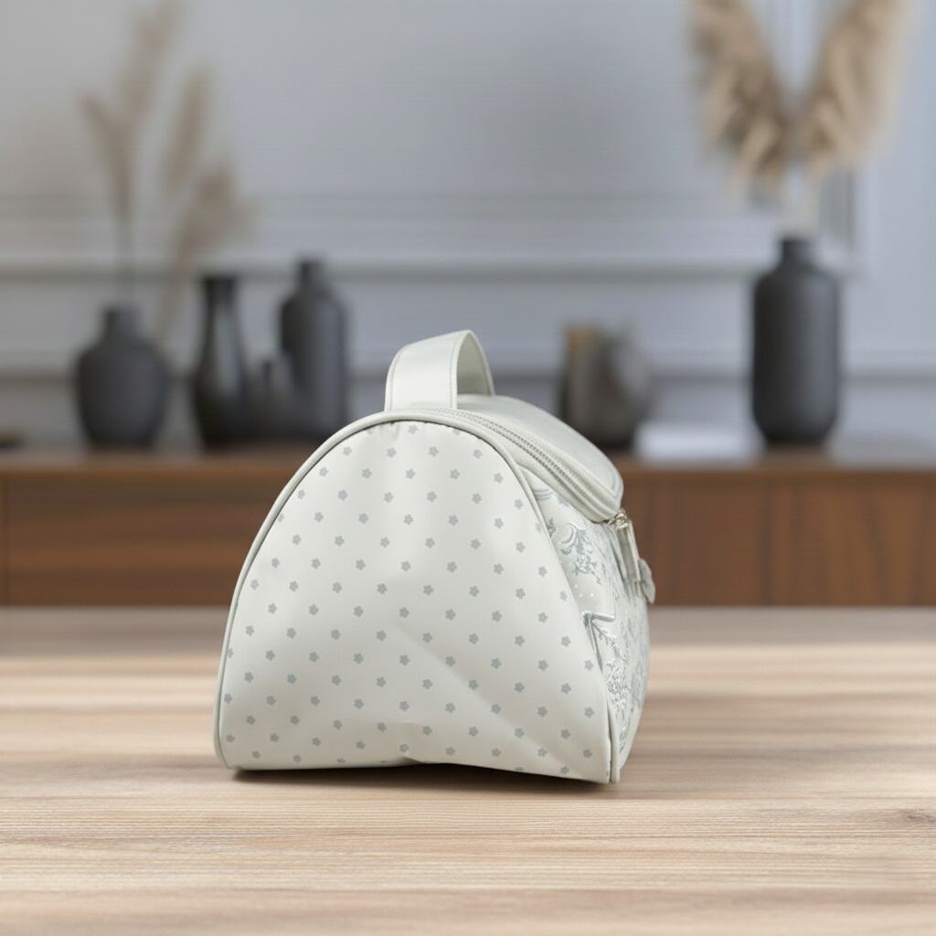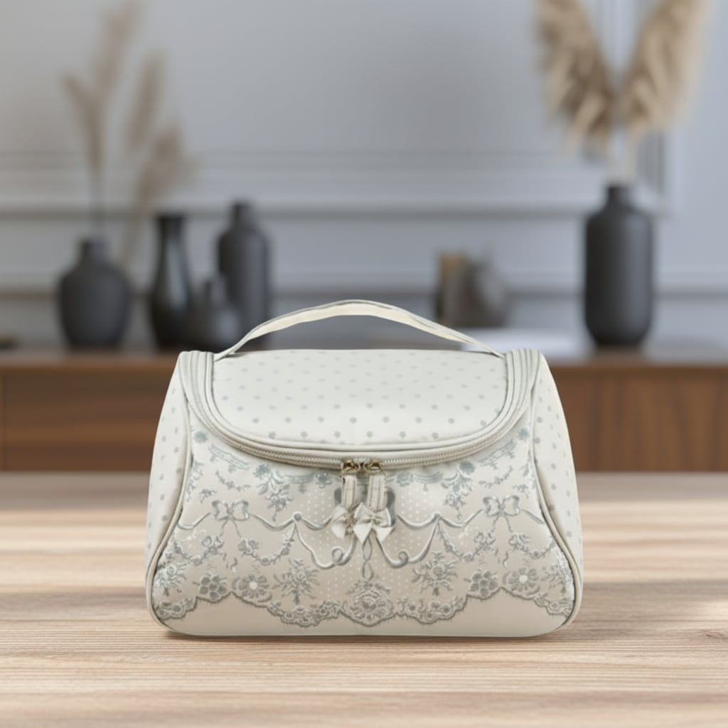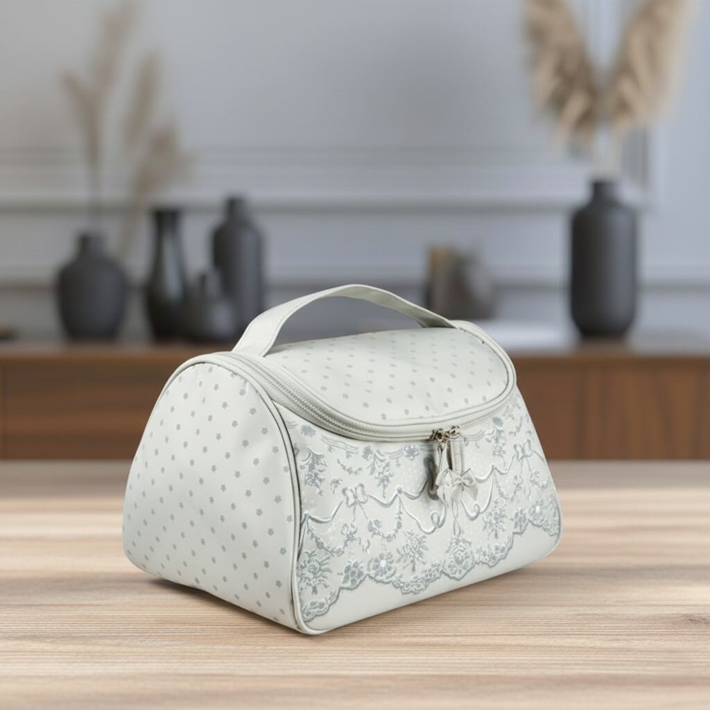 シックなグレーにリボンモチーフをあしらった、洗練されたデザインのコスメバッグです。