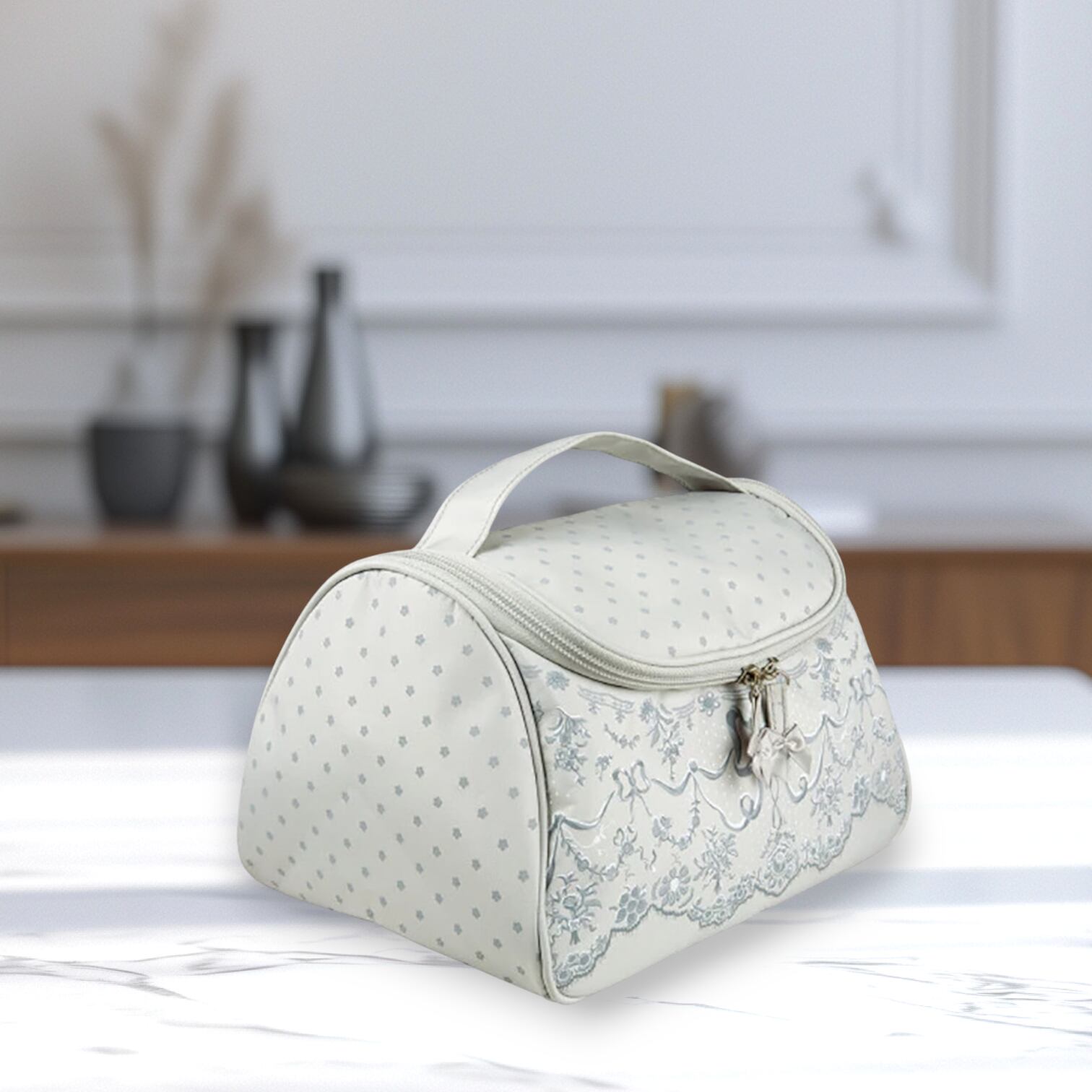 シックなグレーにリボンモチーフの洗練されたデザインが素敵なコスメポーチシリーズです。