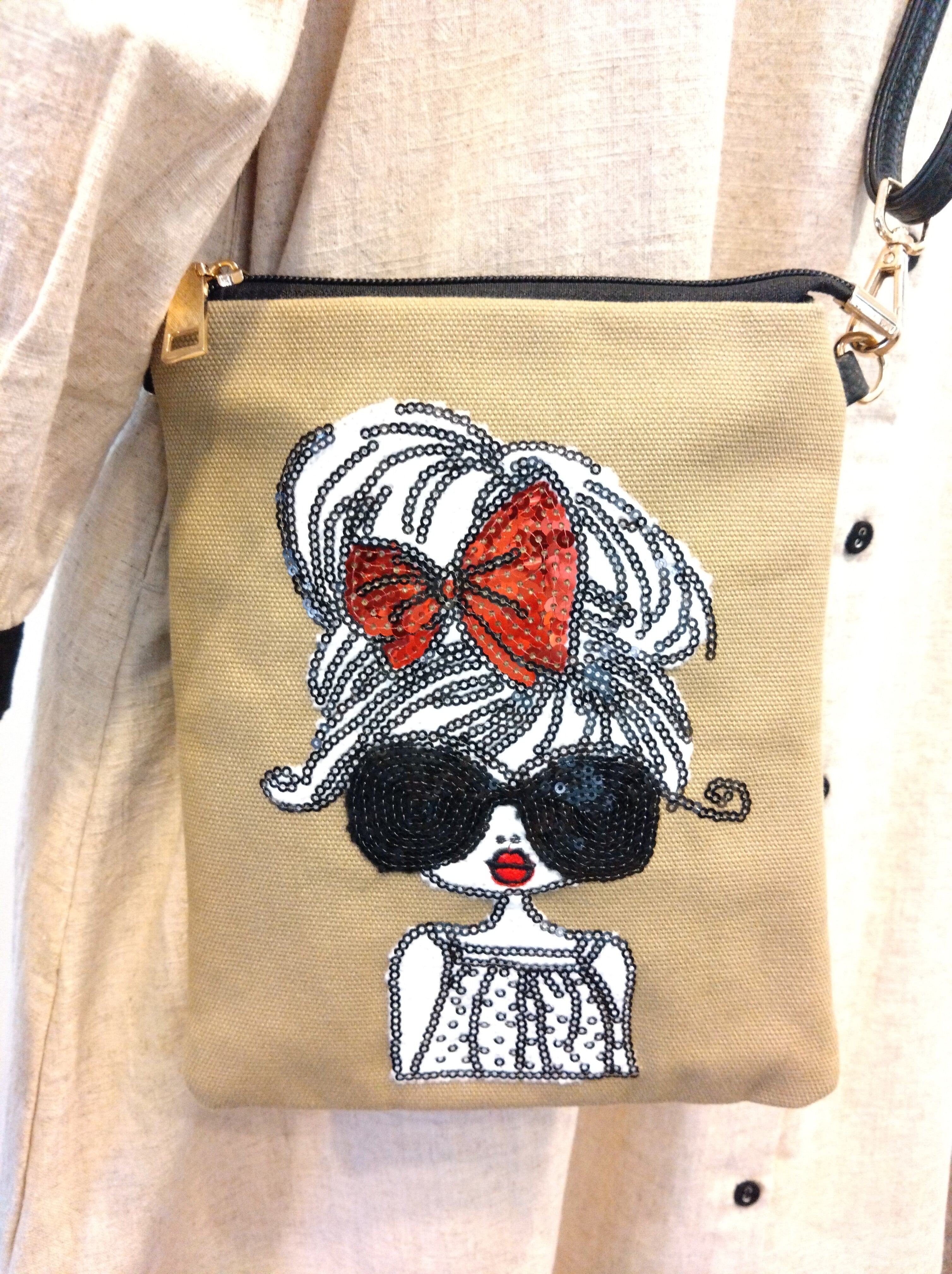 サングラスをかけたレディが印象的な、ポップなデザインの帆布ポシェット。