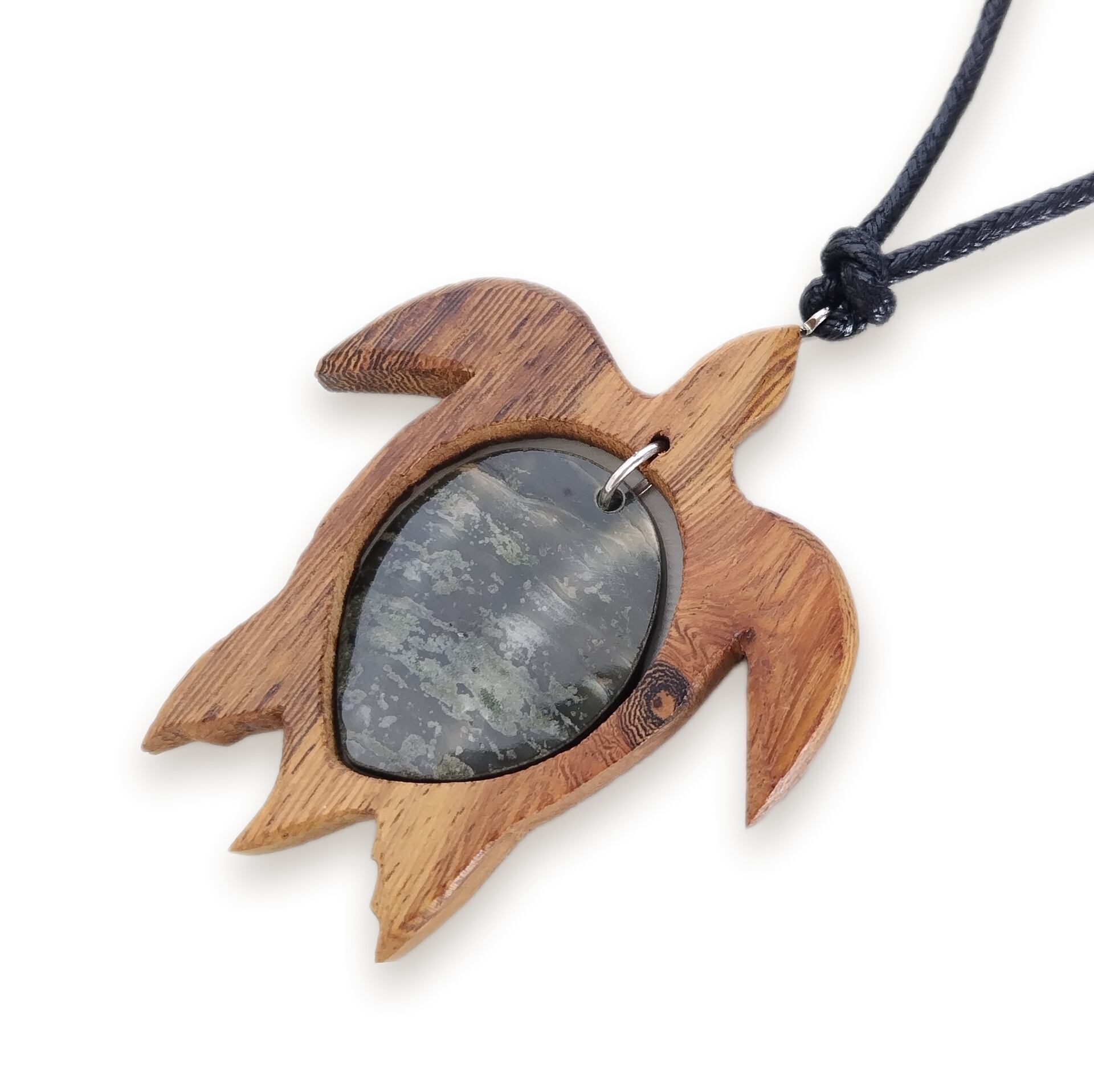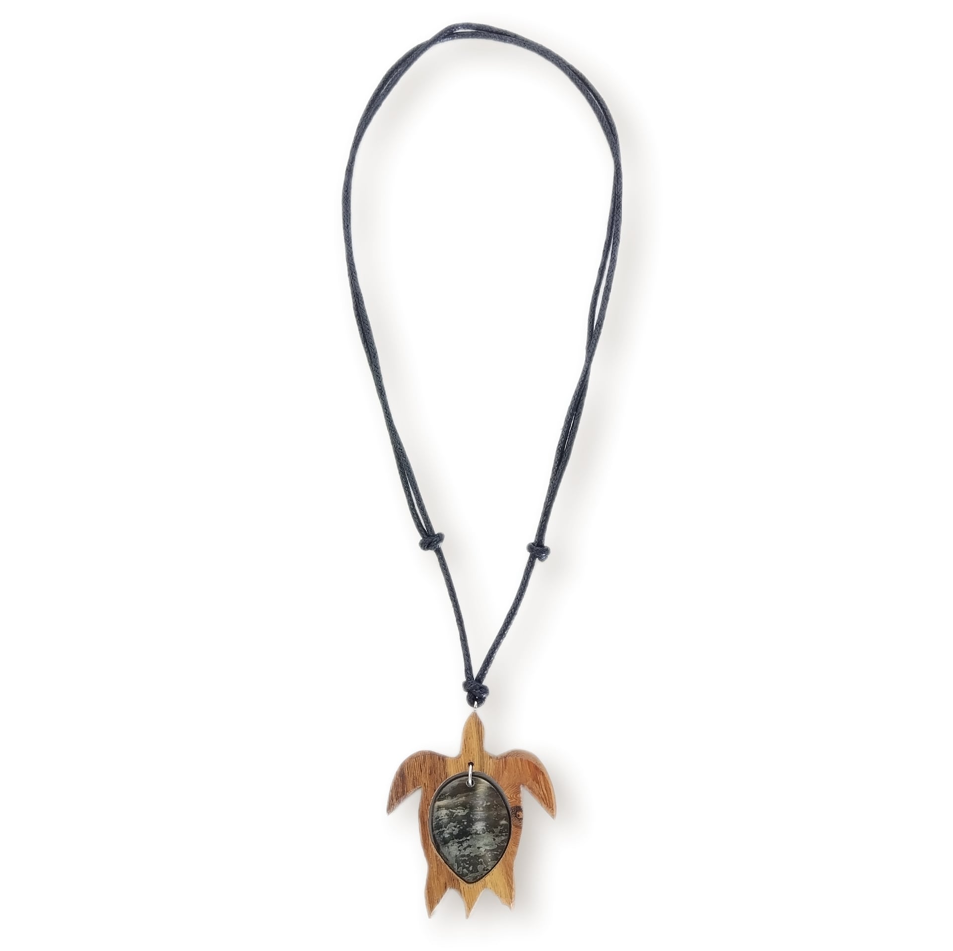 可愛いカメがモチーフのシェルとウッド素材でできたネックレス。