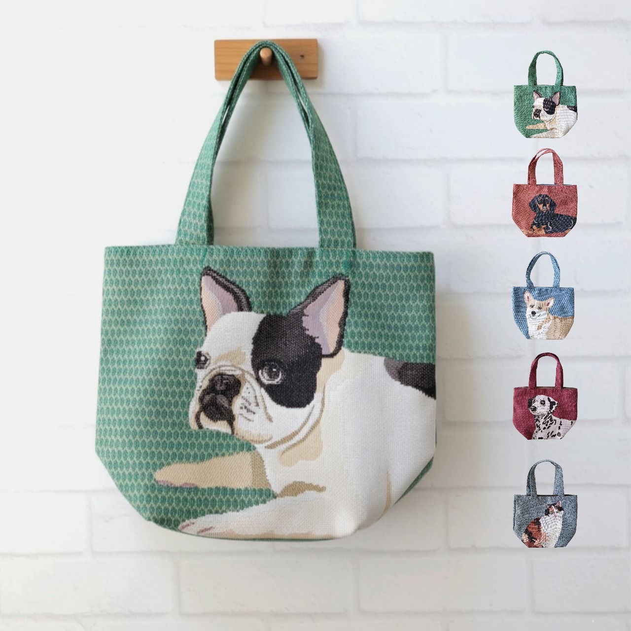 愛らしいペットたちがデザインされた、ゴブラン織りのミニバッグです。