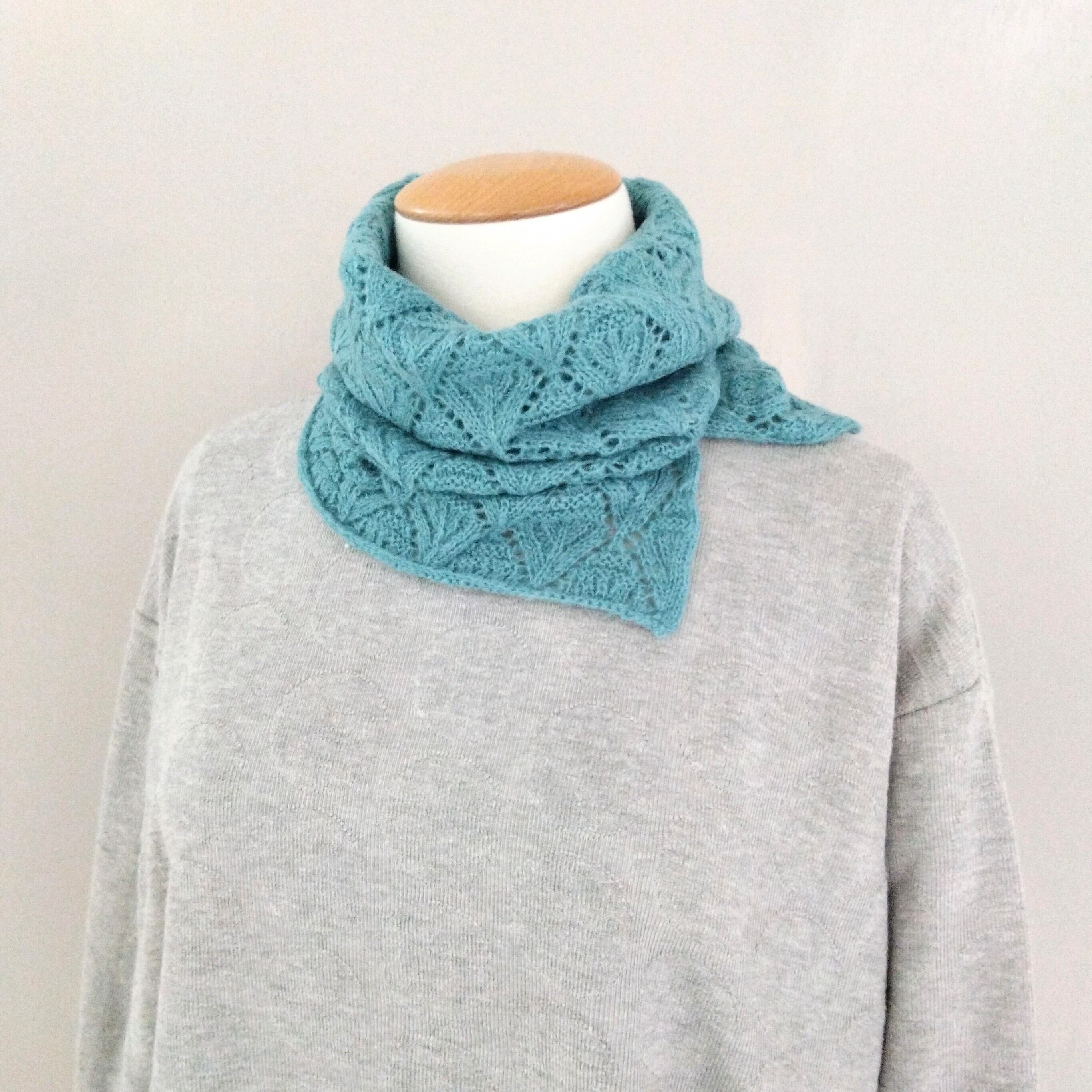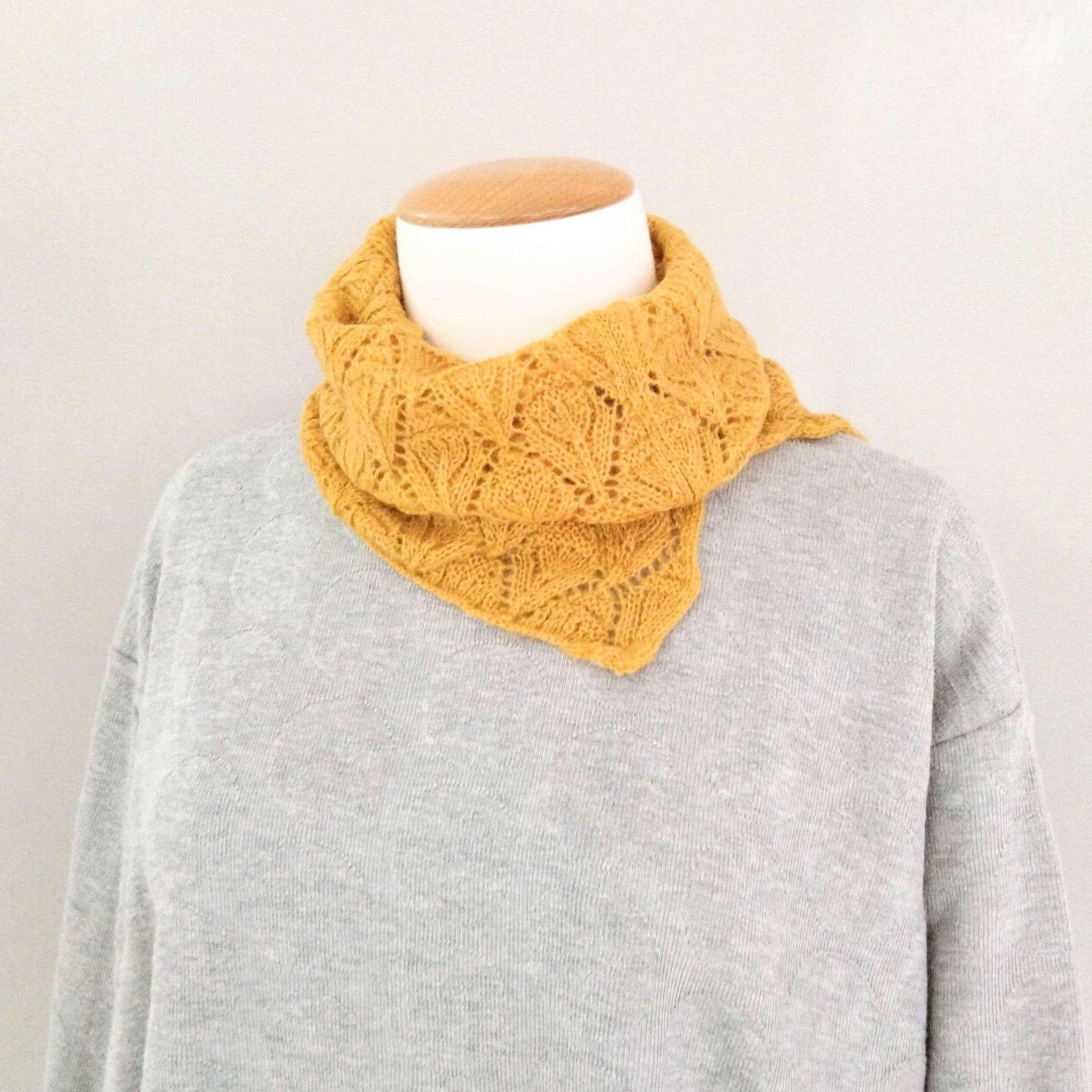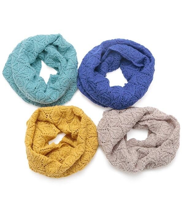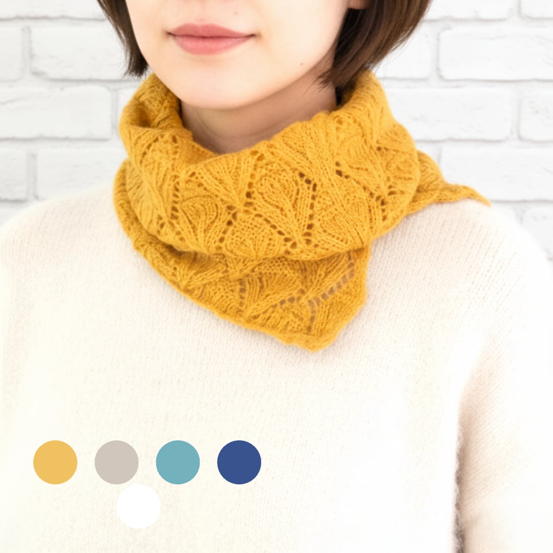 一見シンプルながら、透かし編みの柄がほのかに表情を作り、首もとに柔らかな陰影を添えるニットスヌード。