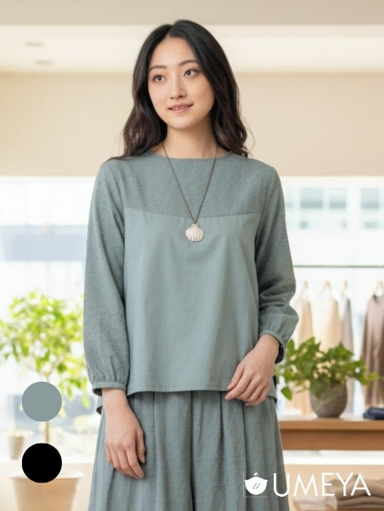 胸元から袖にかけて同色の花柄刺繍が施された、ナチュラルでやさしい印象のブラウス。