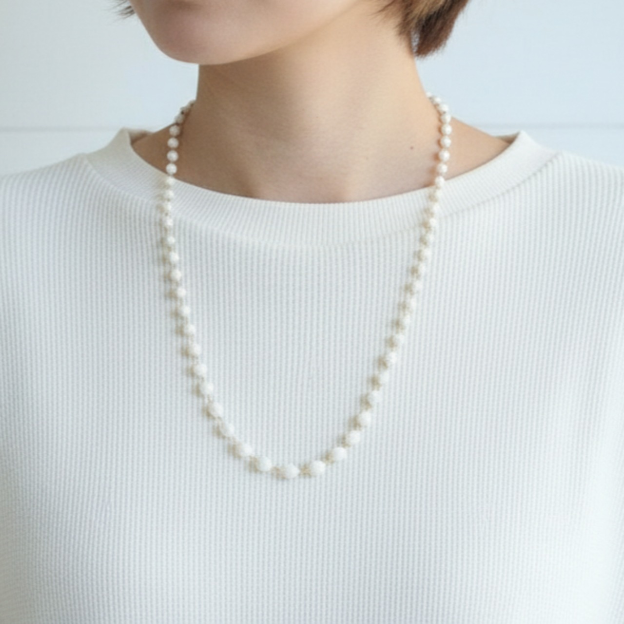 金属のアクセサリーは少し重たく感じる日も、胸もとに小さな華やぎを添えたいときに。